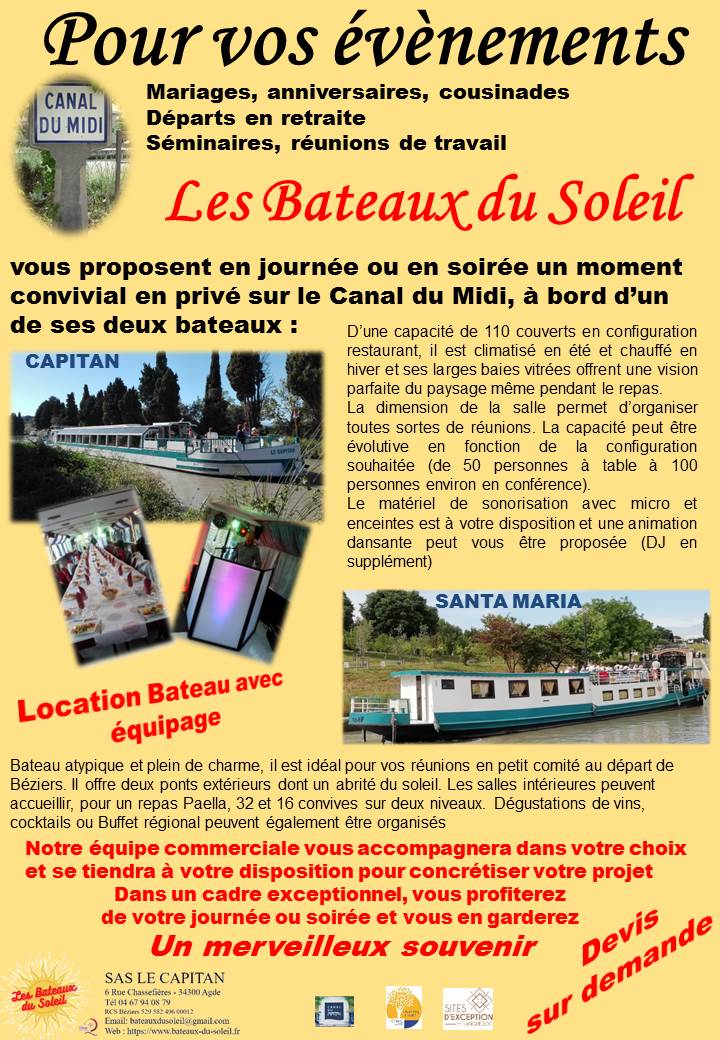 Partez à la découverte du Canal du Midi au départ de la Halte nautique de Vias à bord du bateau LE CAPITAN.