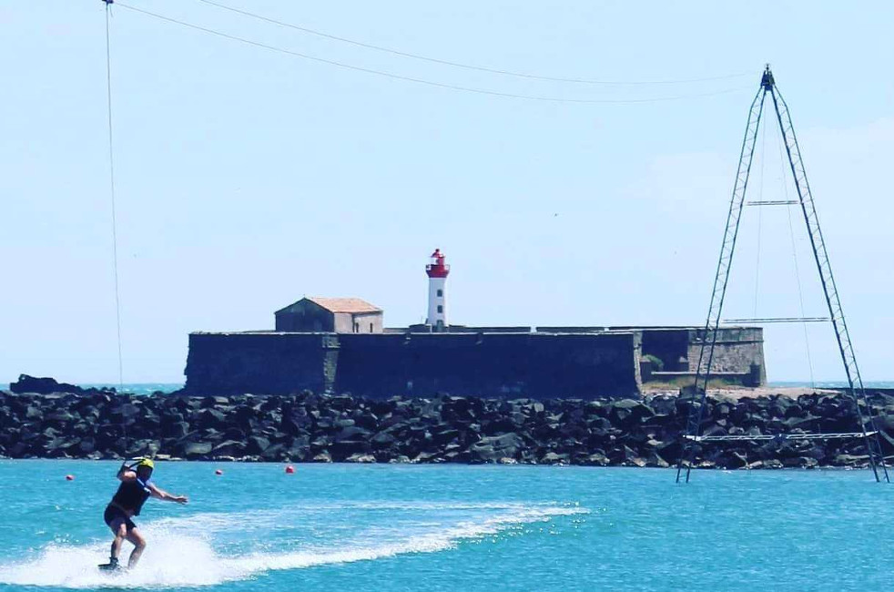 Pratique du téléski nautique, câble tendu entre deux pylônes piloté et encadré par un moniteur permettant de rider afin de pratiquer différents spots de glisse : wakeboard, kneeboard, wakeskate et bouée tractée.