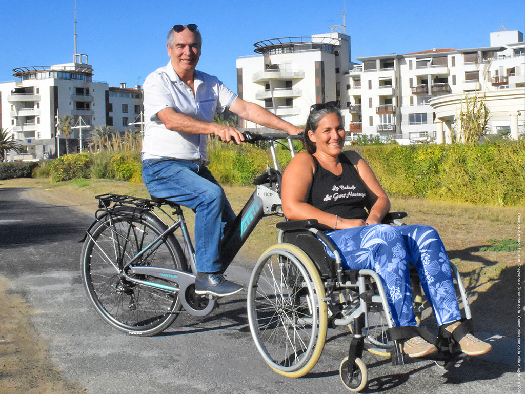 Personnes à mobilité réduite : Handi-balades grâce à un vélo à assistance électrique équipé pour être jumelé à tout type de fauteuils.