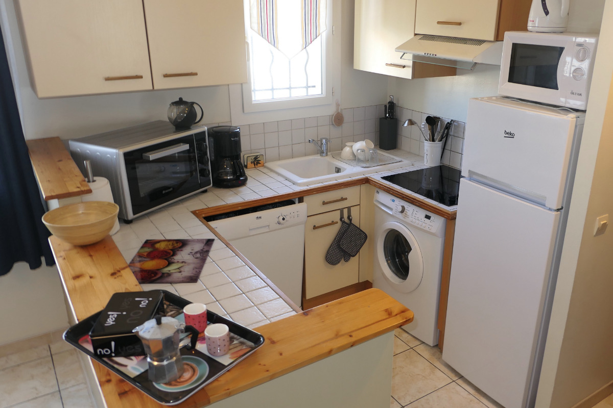La cuisine bien équipée est ouverte sur le séjour, avec tous les appareils nécessaires pour préparer de délicieux repas en famille.