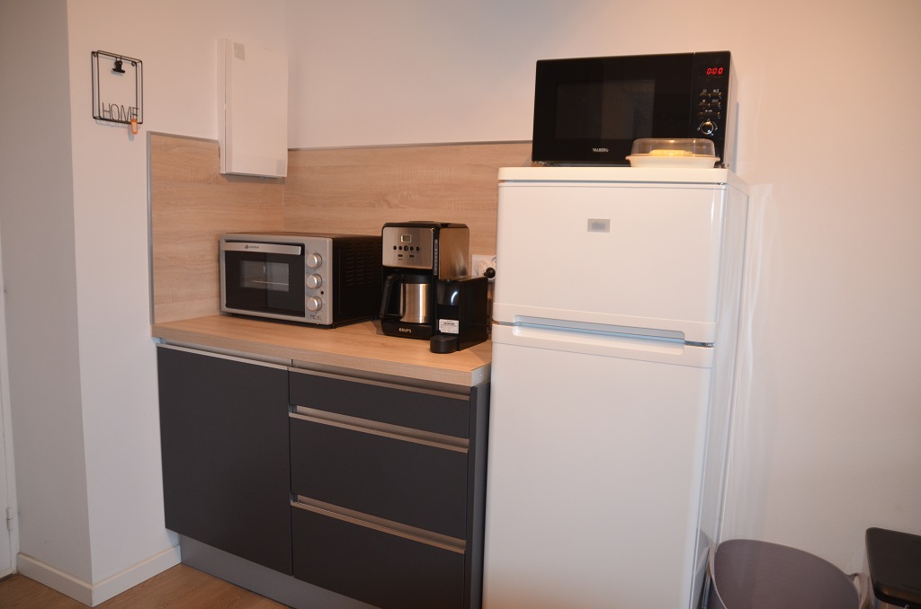 Coin cuisine très bien aménagé avec plaques à induction, mini-four, micro-ondes, machine Nespresso...tout le nécessaire comme à la maison !