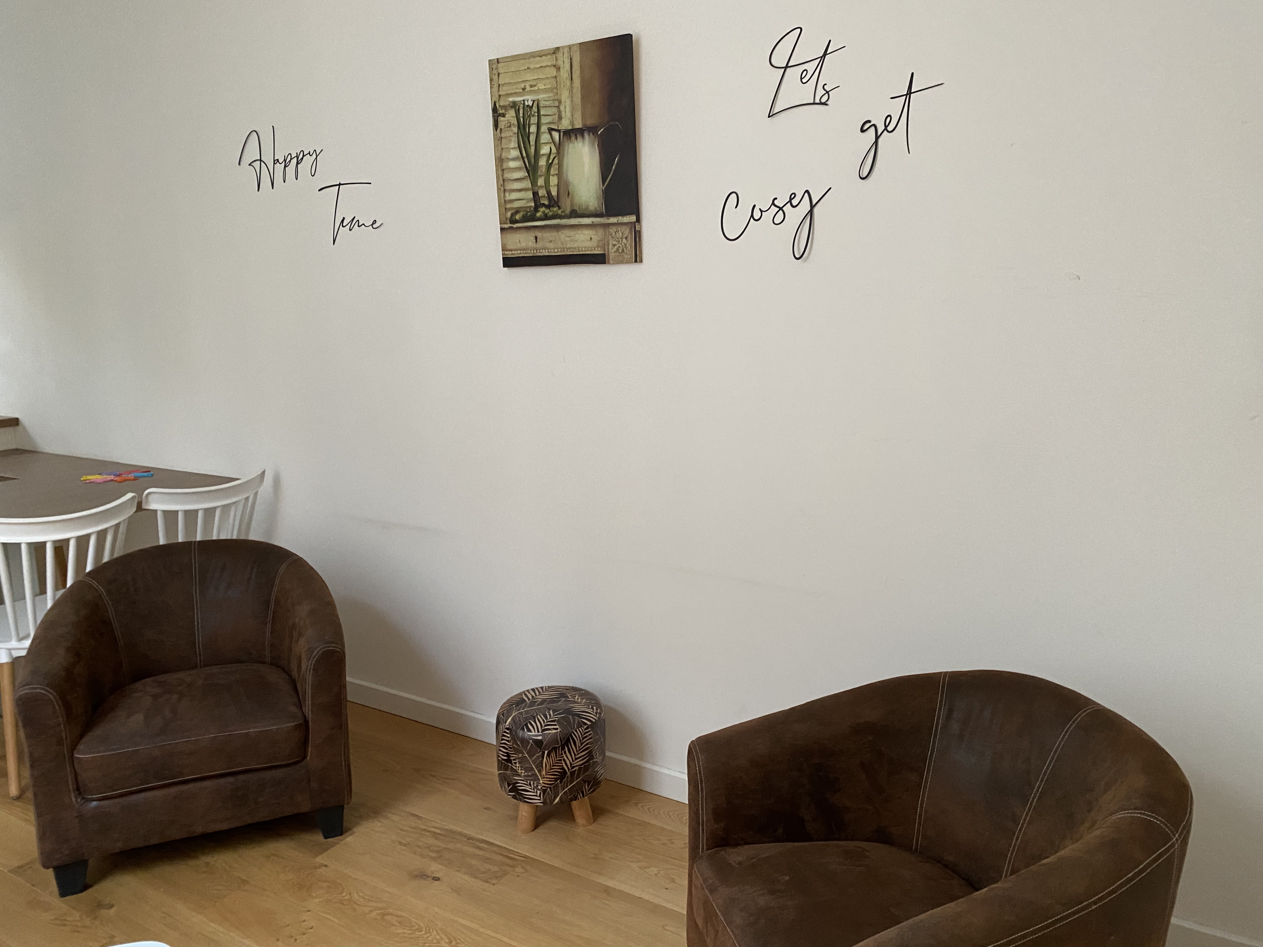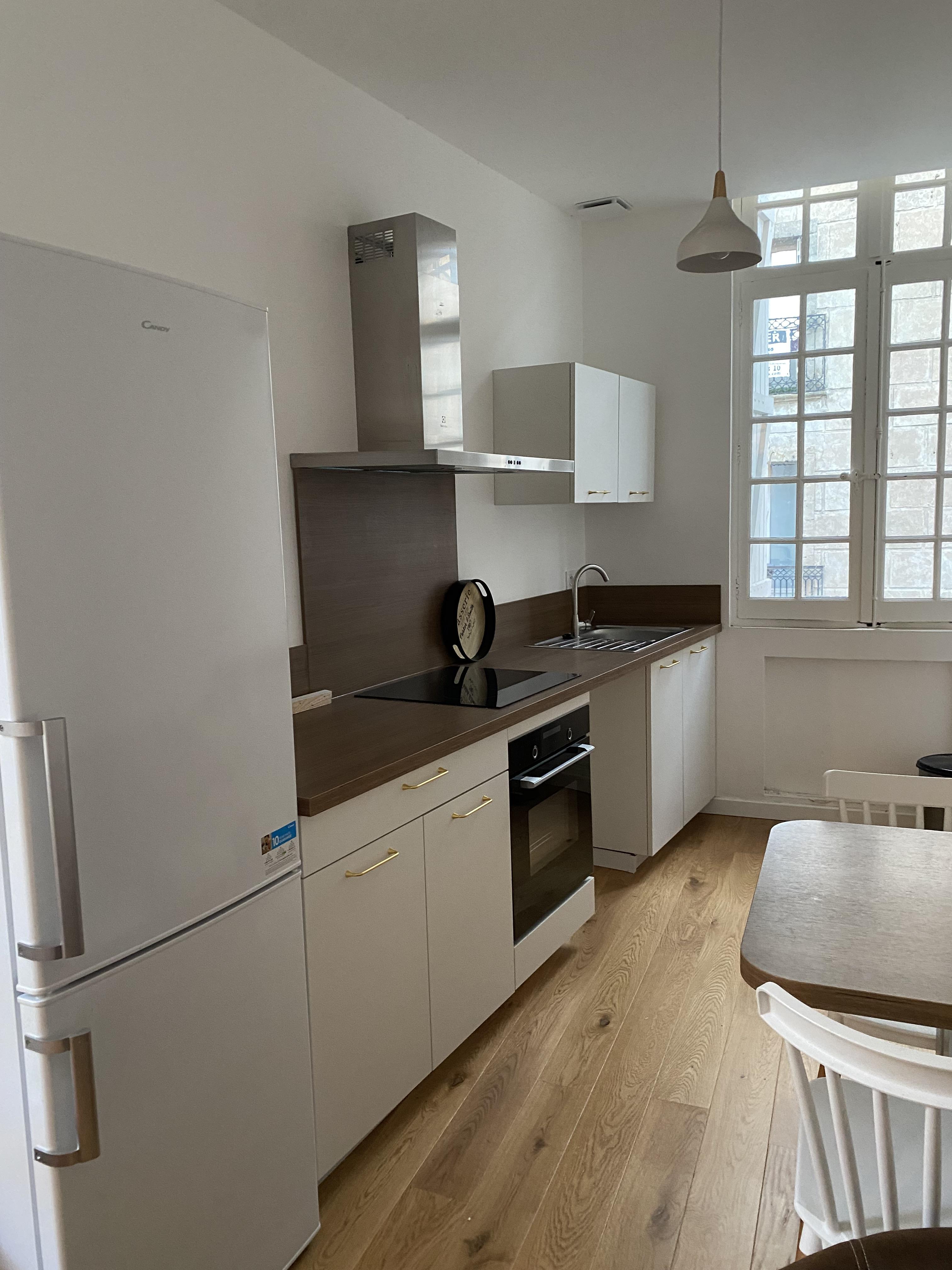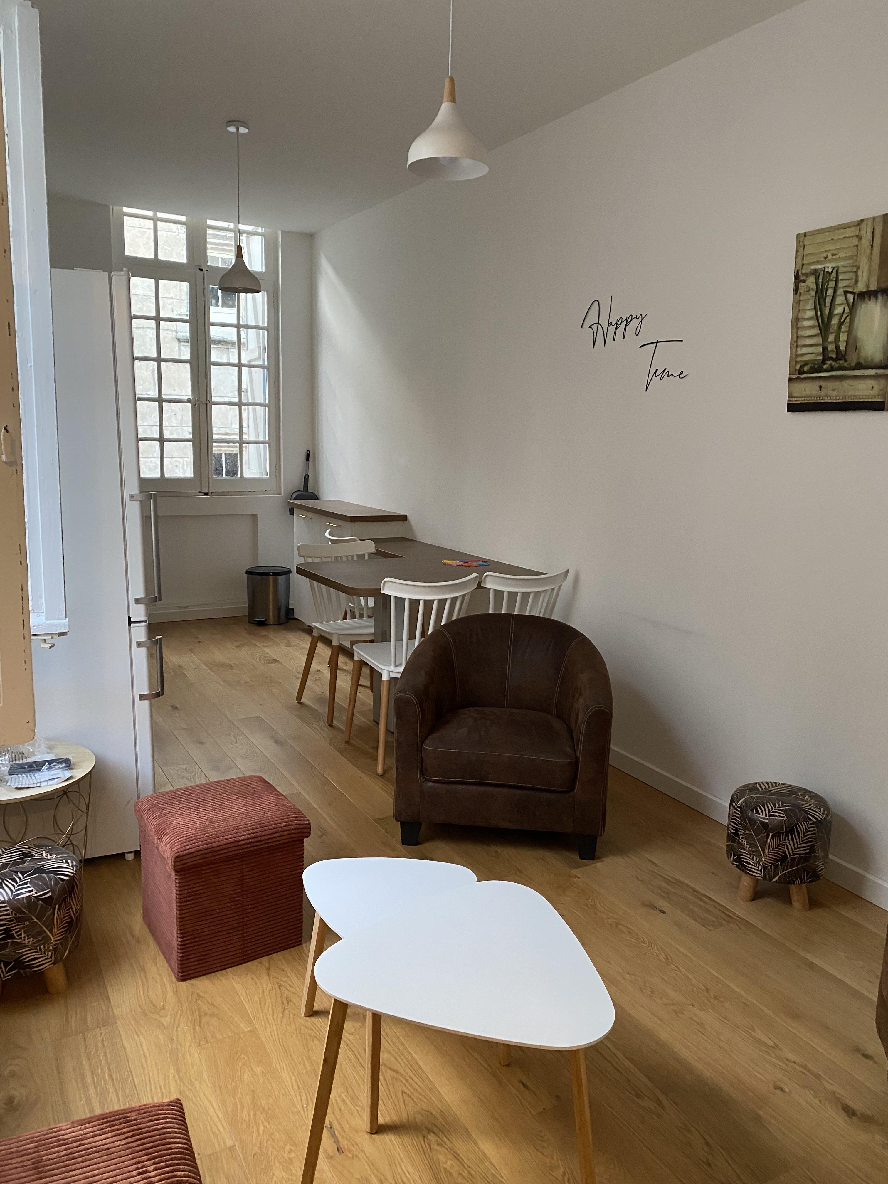 1er niveau séjour/cuisine avec 2 fenêtres : cuisine moderne et bien équipée, coin salon accueillant et décoré avec goût.