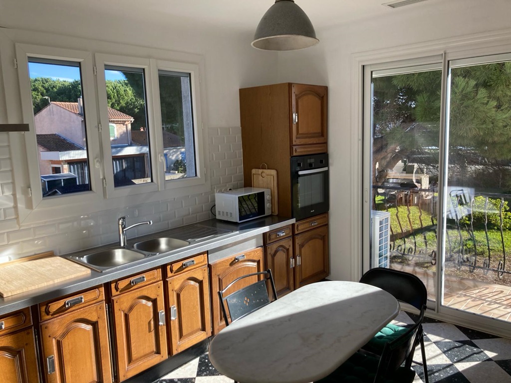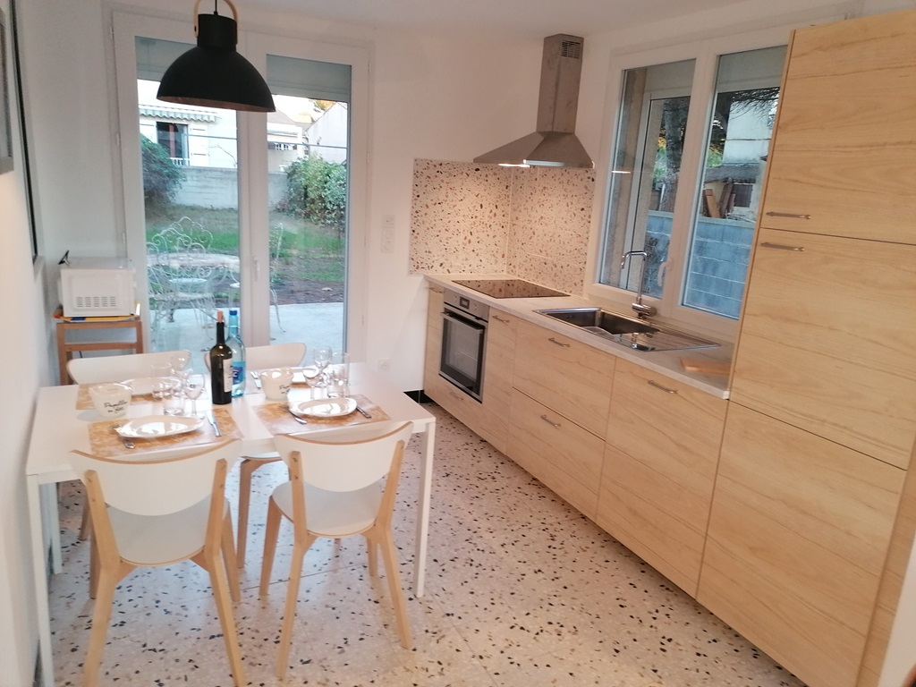RDC : T3 meublé, 2 chambres dont 1 suite parentale, 1 salle d'eau, WC indépendant, cuisine ouverte sur 1 salon séjour, terrasse privée accès direct cuisine.