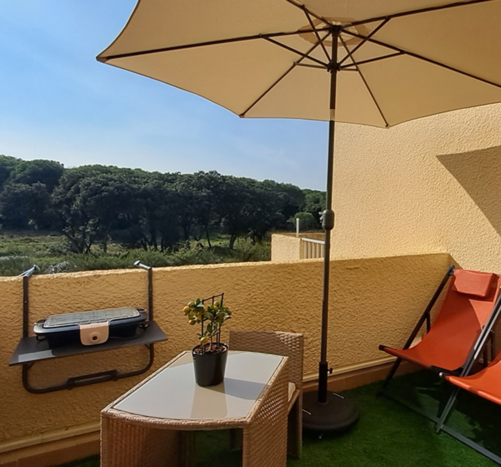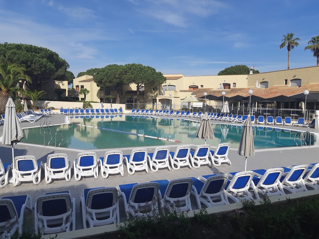Studio climatisé avec terrasse et grande piscine chauffée, à proximité du Centre port, des plages et du Village Naturiste. Résidence sécurisée avec supérette à 50m.