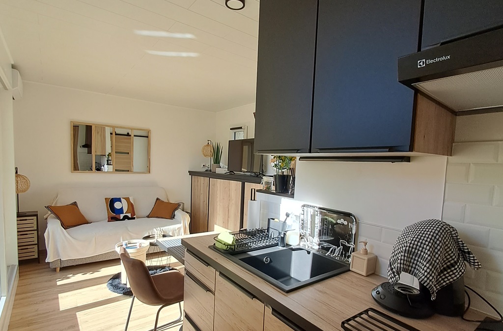 Cuisine neuve avec grand réfrigérateur-congélateur, plaques à induction, machine à laver et four micro-ondes.