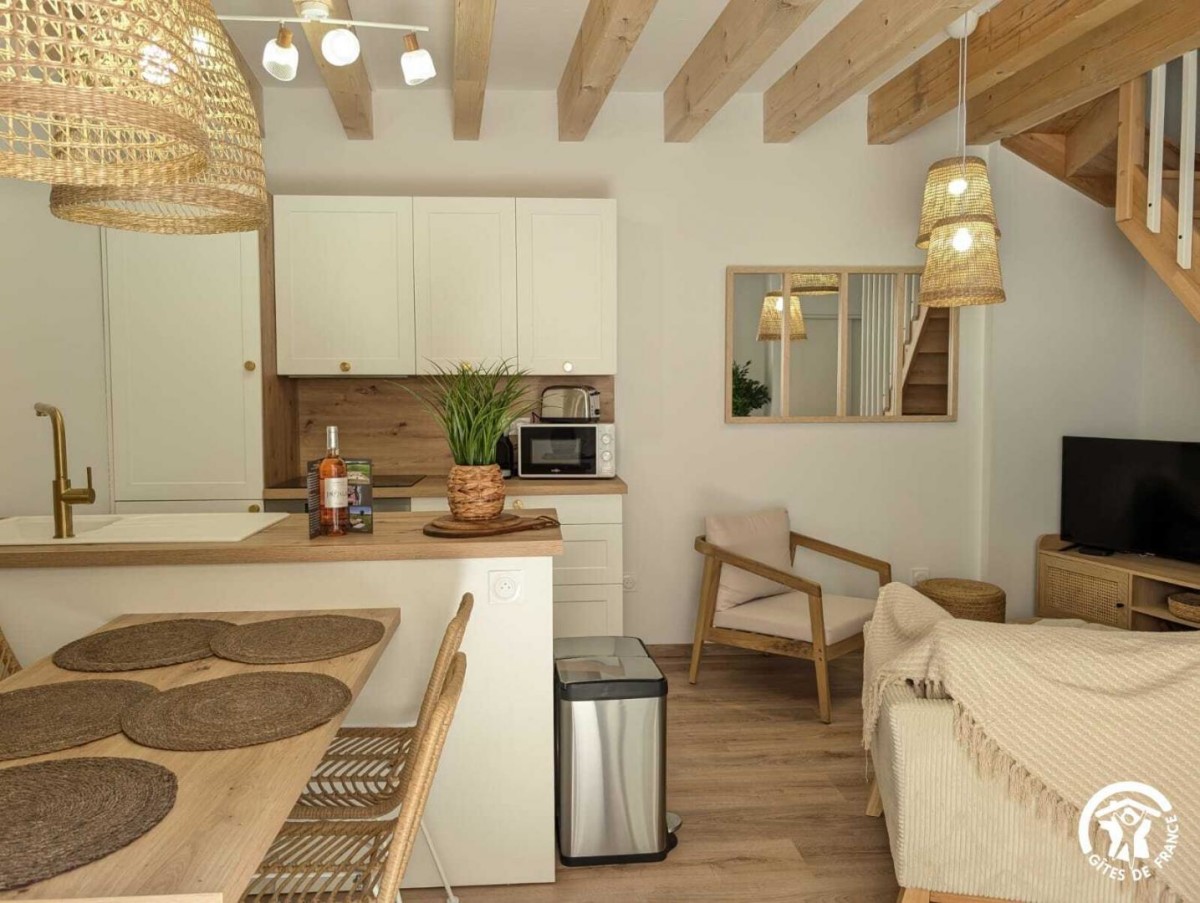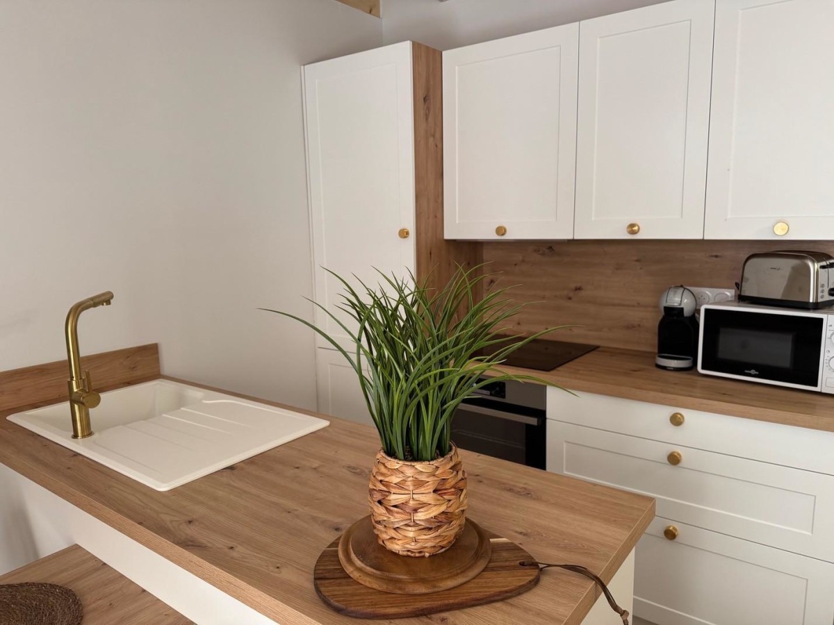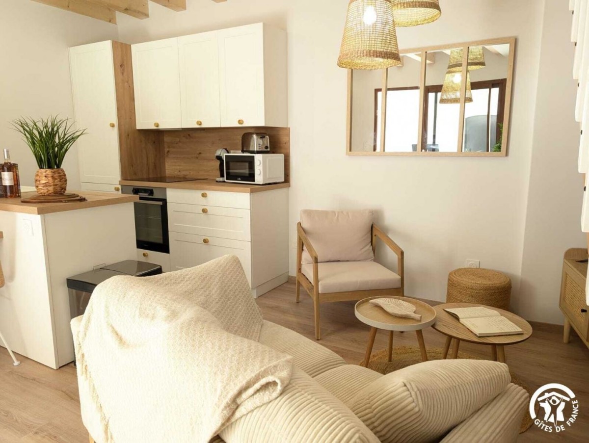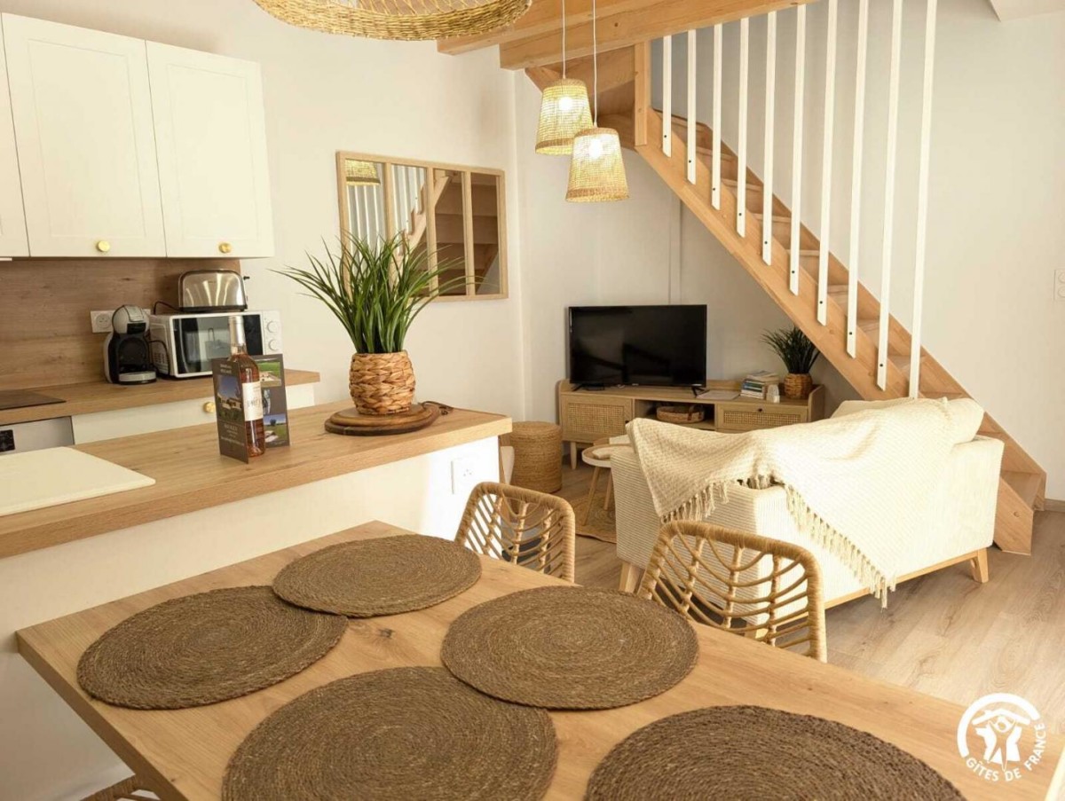 - Un séjour avec cuisine ouverte tout équipée (frigo, plaque de cuisson, four, lave-vaisselle, cafetière dosette, bouilloire, congélateur.