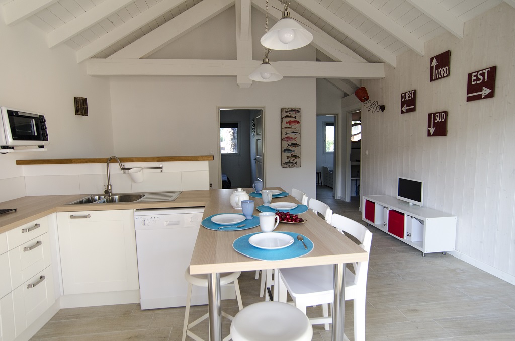 Au calme, sous les pins, à 1 km de la plage et du centre du village, maisonnette en bois de plain pied, de construction récente et décorée thème mer.