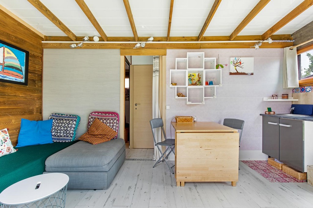 Coin séjour avec couchage pour une ou deux personnes.