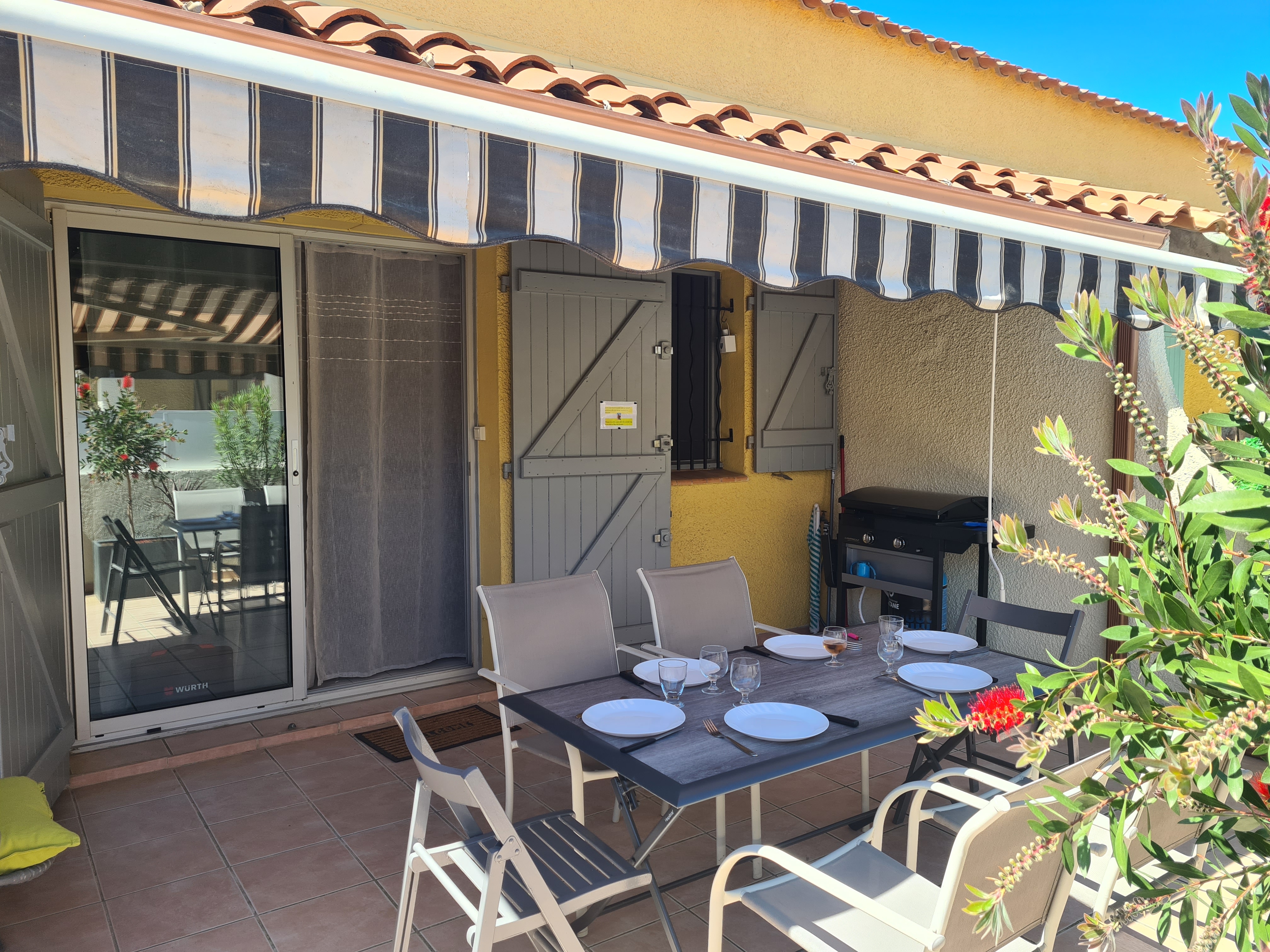 Maison dans résidence sécurisée avec parking privatif. Vous disposez d'une terrasse joliment décorée avec salon de jardin et plancha. Un terrain de pétanque est à disposition dans la résidence.