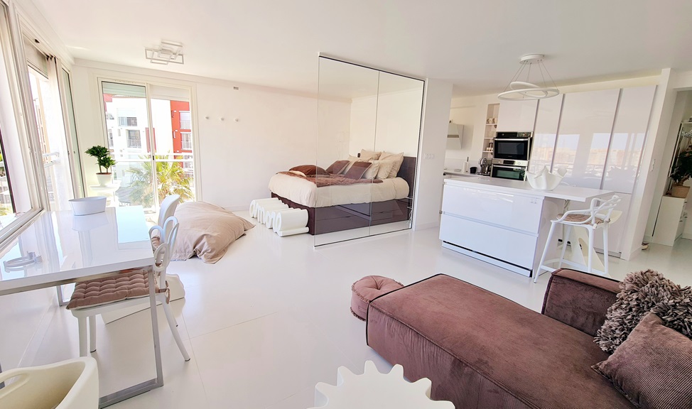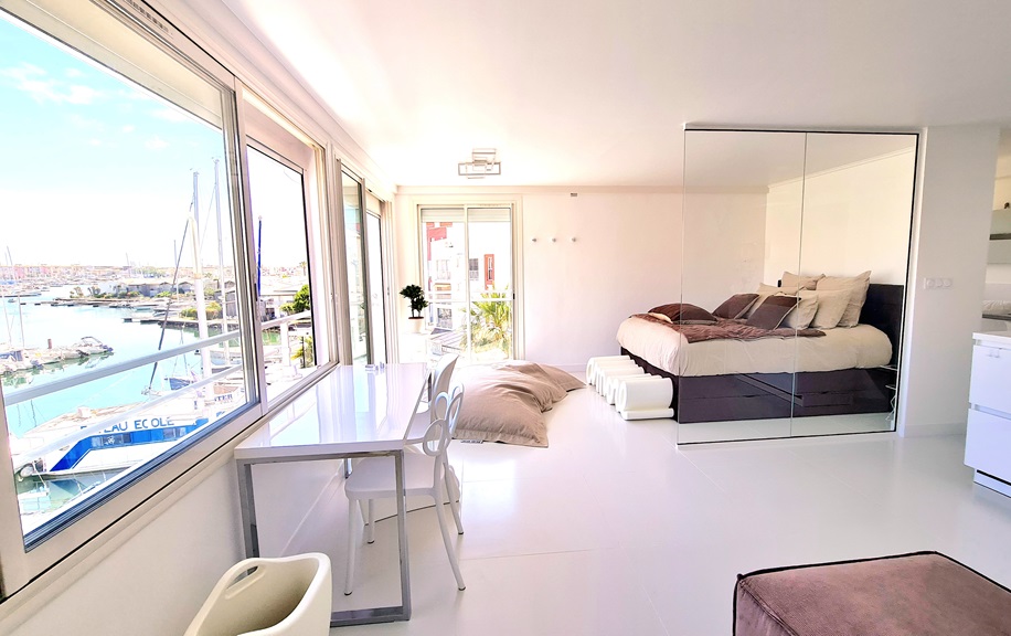 La suite se compose d'un grand séjour avec coin nuit, d'un lit queen-size surélevé pour une vue panoramique privilégiée, d'un coin salon, d'un coin bureau-lecture et d'une cuisine américaine moderne, toujours avec vue sur la marina. Une salle de bain avec douche à l'italienne. Tous les équipements et mobiliers mis à votre disposition sont neufs et de dernière génération.