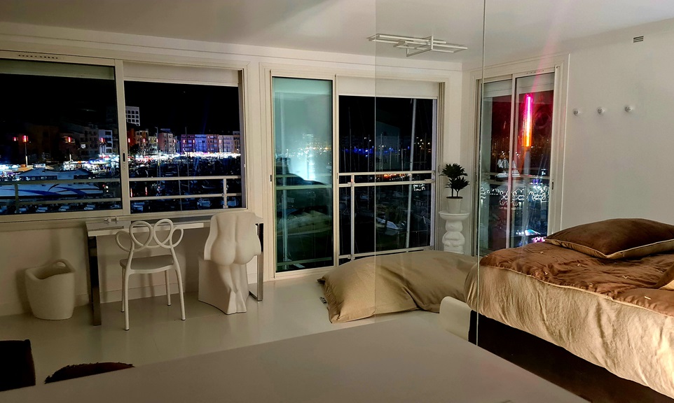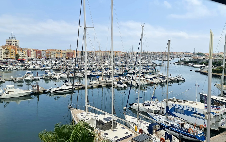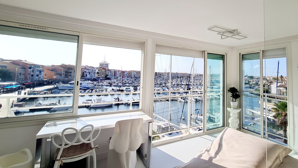 Vue panoramique à 180° degrés sur la marina du Cap d'Agde - Suite privée de 55 m², classée 5 étoiles en meublé de tourisme - Design, élégance, raffinement - Equipements haut de gamme.