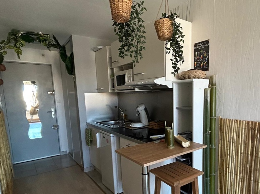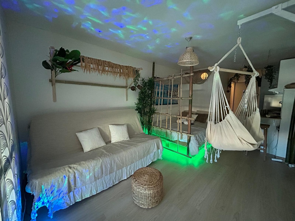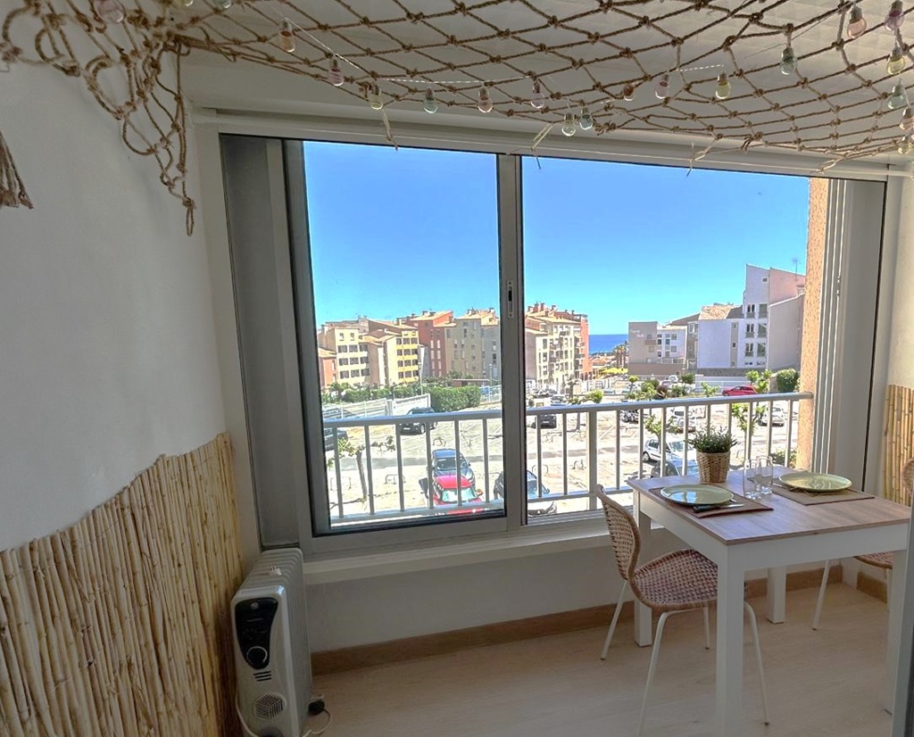 Logement entièrement rénové et décoré façon "paillote", avec petite vue mer dans la loggia pour un dîner romantique ou en famille. Grande ouverture de la baie vitrée pour bien profiter de la vue mer (2ème étage).