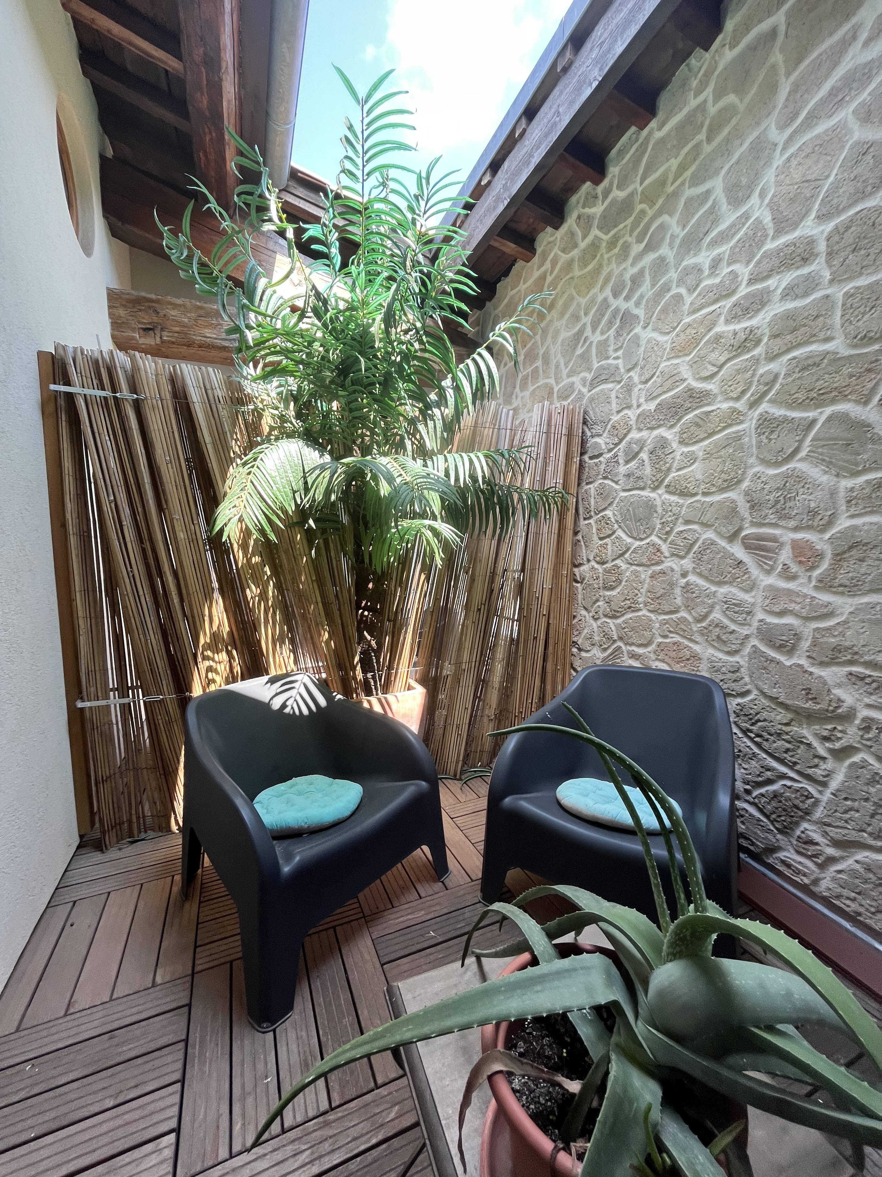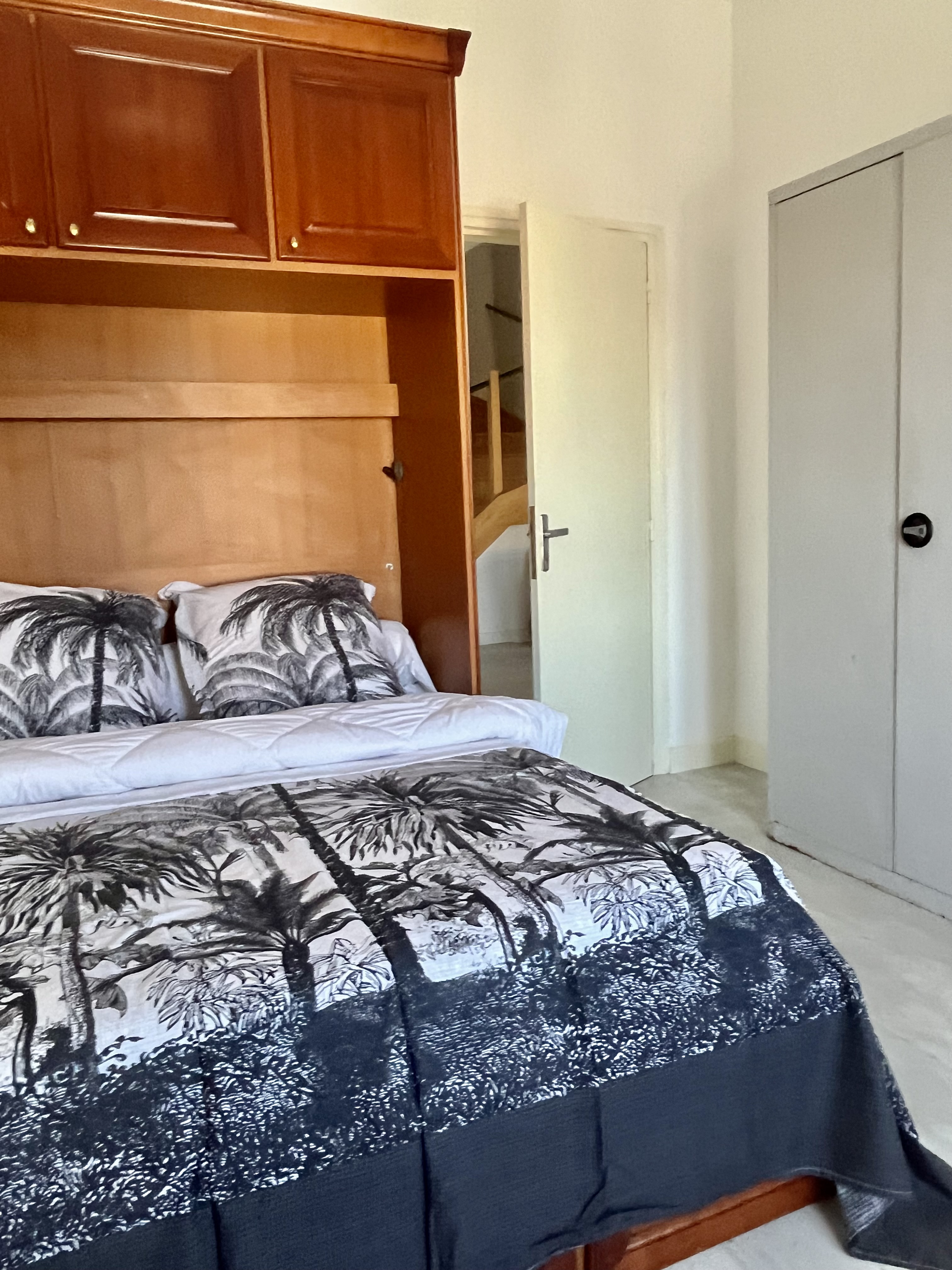 Terrasse et balcon, avec vue sur le village. Ce meublé climatisé, comprend 3 chambres, un salon, une cuisine entièrement équipée ainsi qu'une salle de bain avec douche à l'italienne, toilette et climatiseur mobile. Literie de haute qualité;