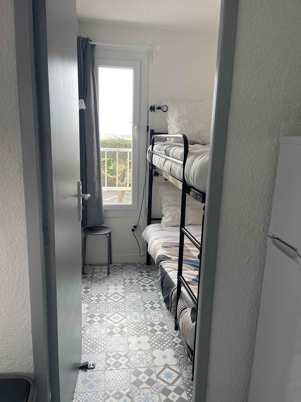 Pièce à vivre avec un BZ équipé d'un matelas en 140, une pièce fermée avec 2 lits superposés. Salle d'eau avec douche italienne et WC.