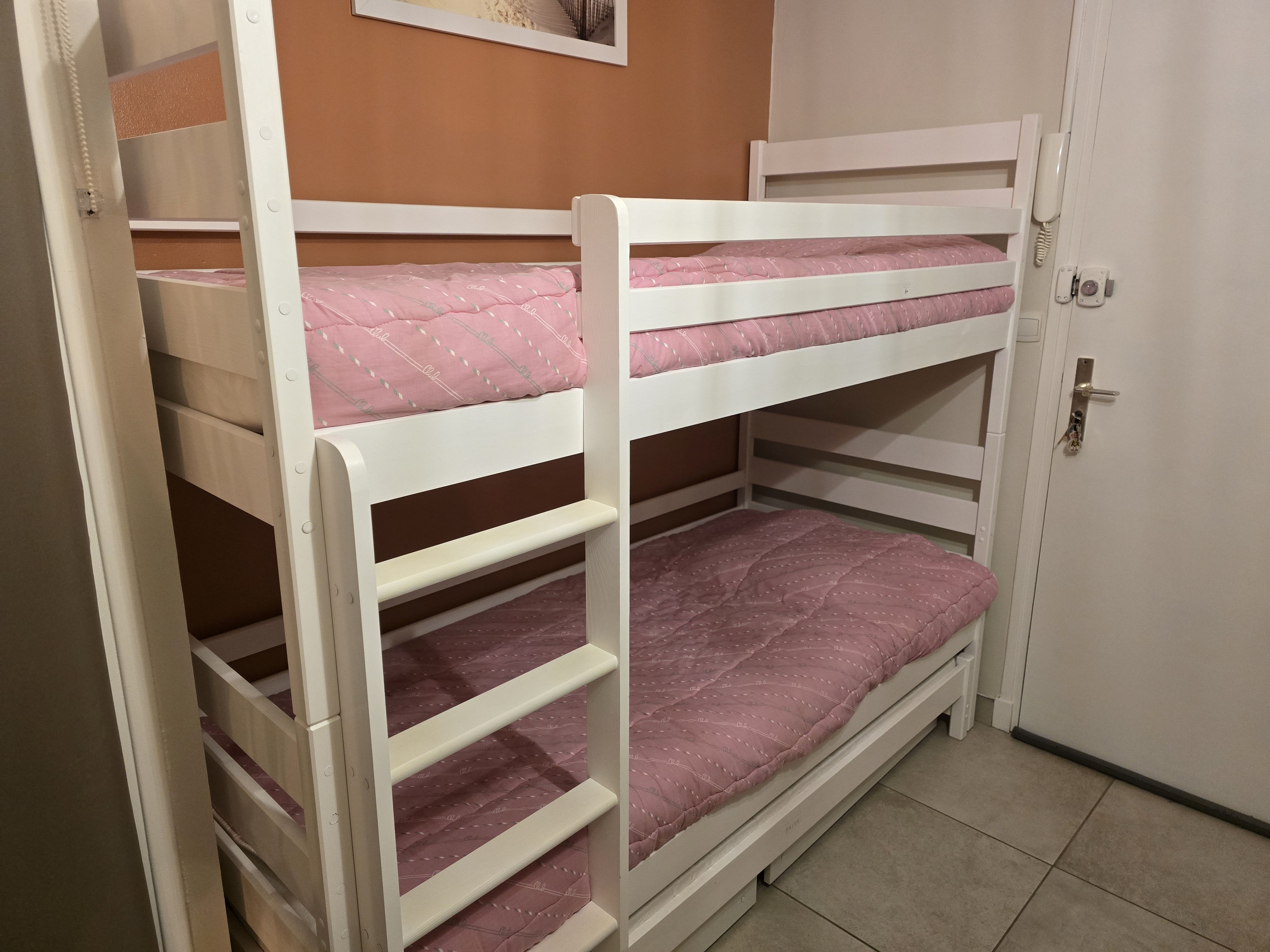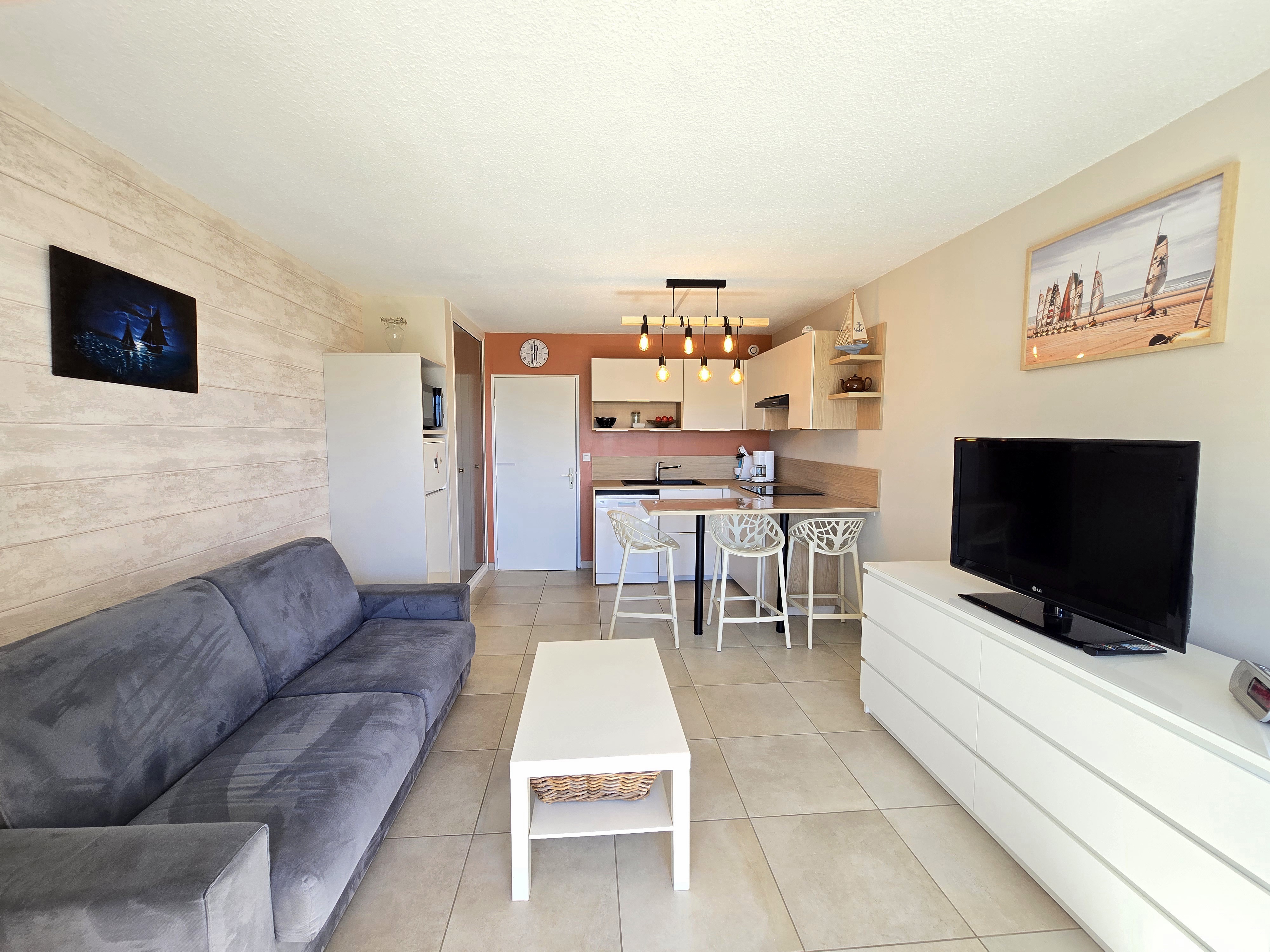 Couchages Neufs 1 Canapé Rapido avec literie de qualité dans le séjour + Lits superposés (lits et matelas neufs) dans le coin cabine.