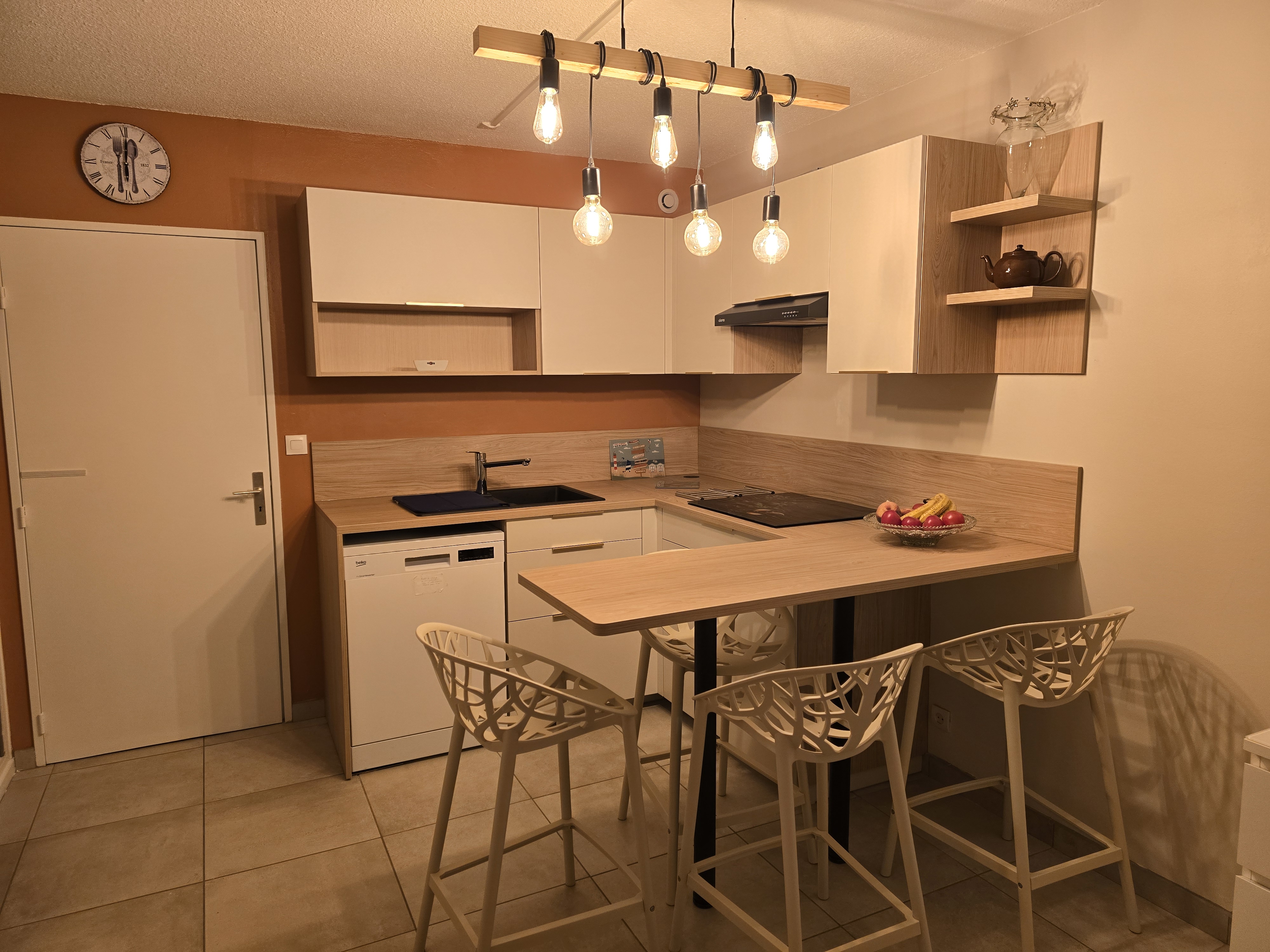 Cuisine Neuve Équipement complet : Combiné four/micro-ondes, lave-vaisselle, plaque à induction, réfrigérateur/congélateur.