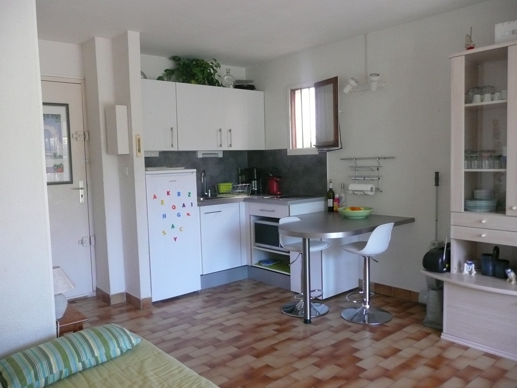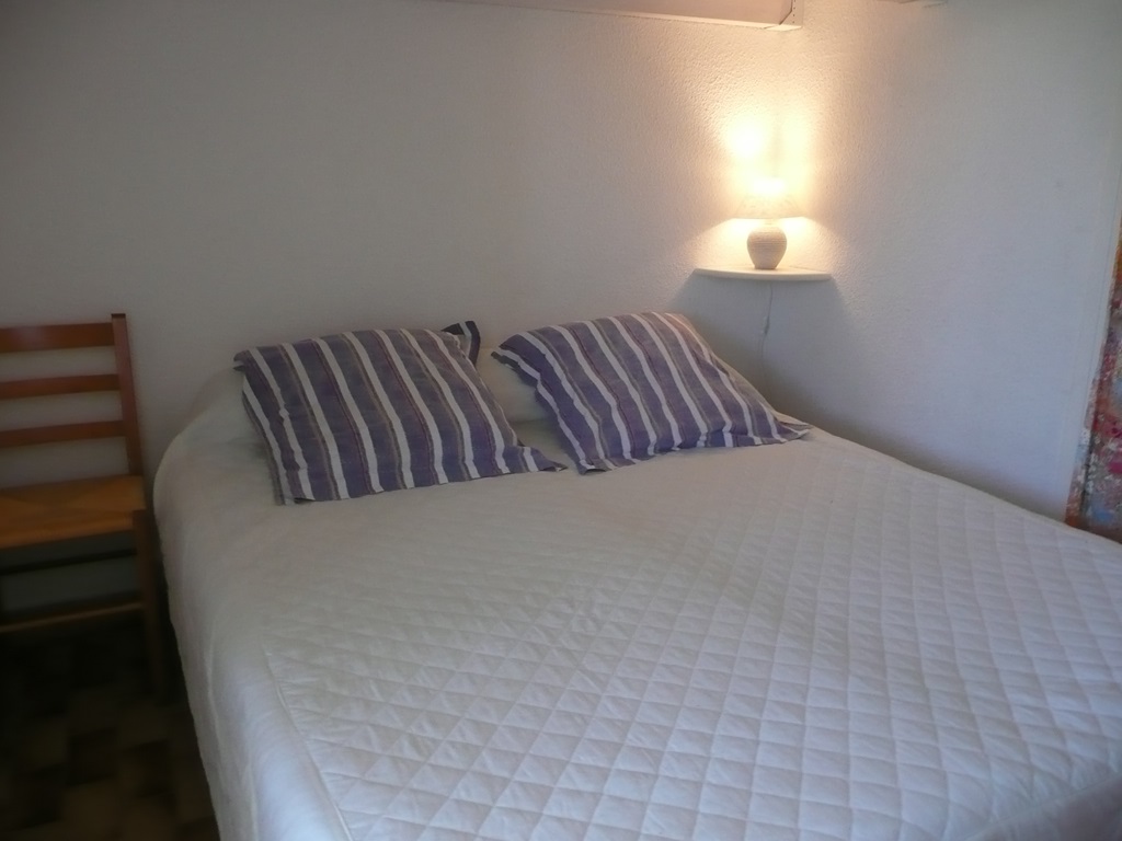 Appartement T2 (27 m²) 4 personnes en RDC, exposition Sud, comprenant 1 séjour/salon (clic-clac en 130) et coin cuisine, 1 chambre avec penderie (1 lit en 140), 1 salle de douche avec wc, 1 véranda avec salon de jardin (10 m²), 1 jardin ombragé (20m²).