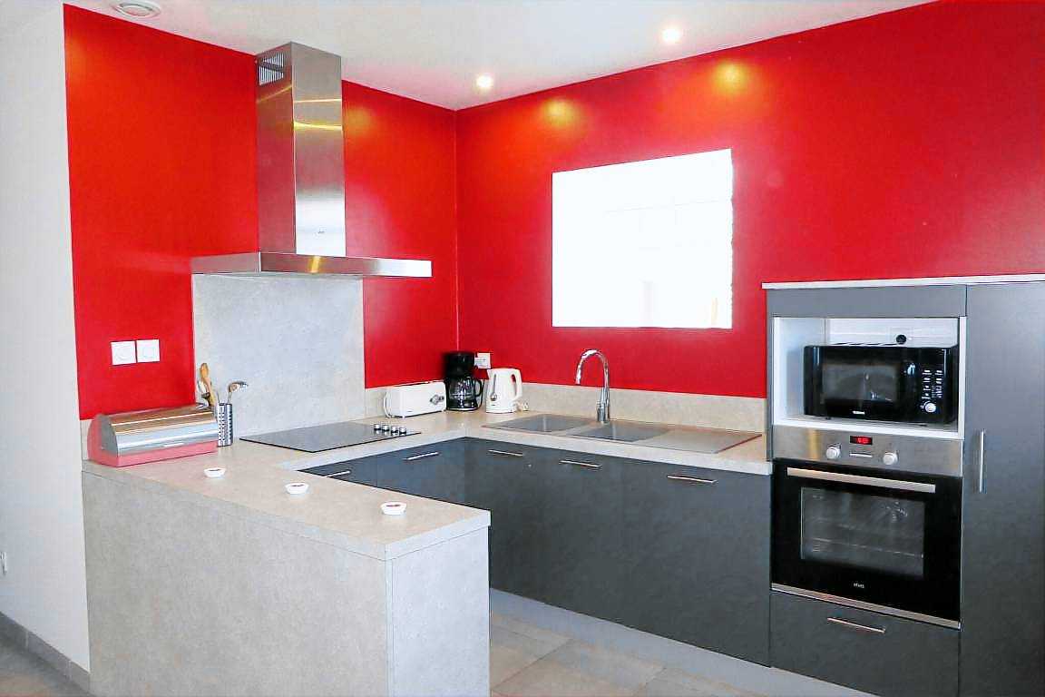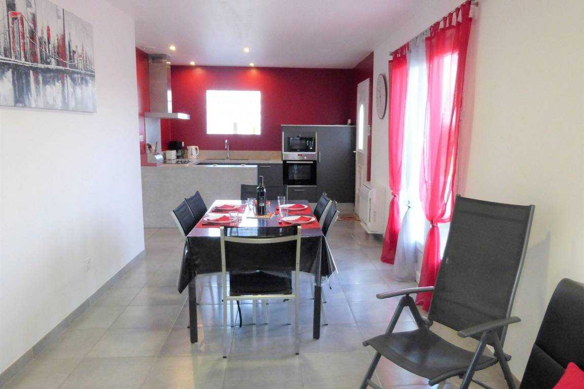 Elle se compose de 2 chambres doubles, d'une salle d'eau, d'un toilette à part, d'une cuisine américaine équipée (lave-vaisselle, micro-ondes, four, plaque de cuisson vitrocéramique, cafetière), d'un coin salon, salle à manger avec télé, clim réversible, et d'un cellier comprenant un fer avec une table à repasser et une machine à laver.