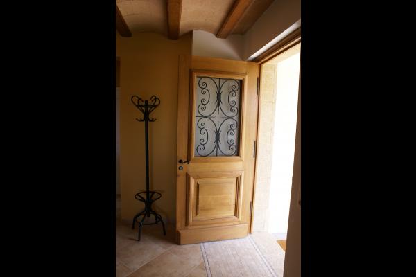 Une porte-fenêtre et la porte d'entrée ajourée laissent filtrer la lumière et permettent un accès direct à la terrasse.