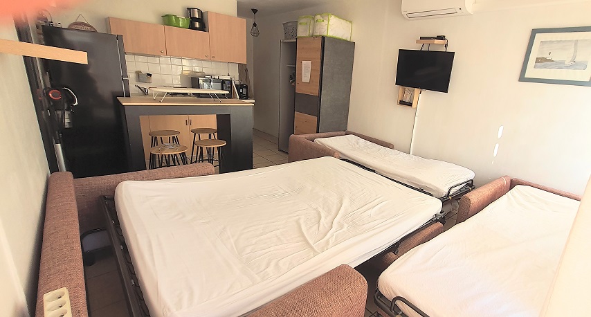 Proximité des commerces, du port et de la plage. Séjour sans voiture. Studio climatisé depuis 2022. Propriétaire trés à l'écoute.
