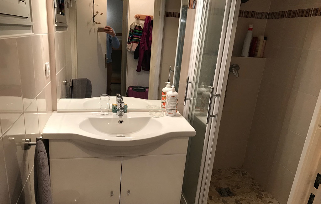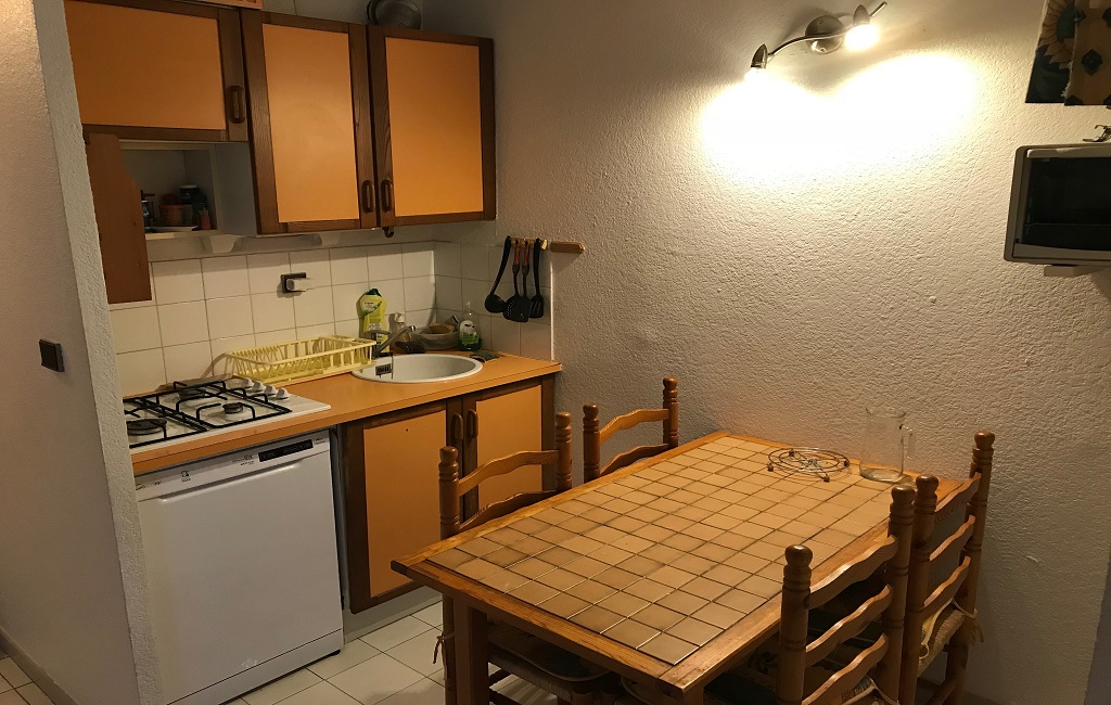 Séjour avec coin cuisine bien équipé, une chambre avec un lit en 140 et une chambre avec 2 lits superposés en 90. Salle d'eau avec douche à l'italienne. Wc séparé. Loggia