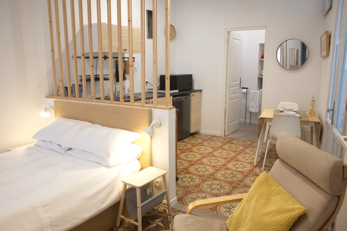 Le studio dispose d'un lit double, de nombreux rangements, d'un coin détente séparé et d'un coin repas. La cuisine est bien équipée avec un micro-onde grill, une plaque chauffante et un réfrigérateur avec un petit compartiment congélateur.