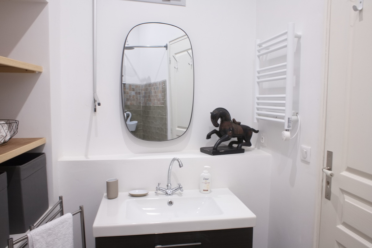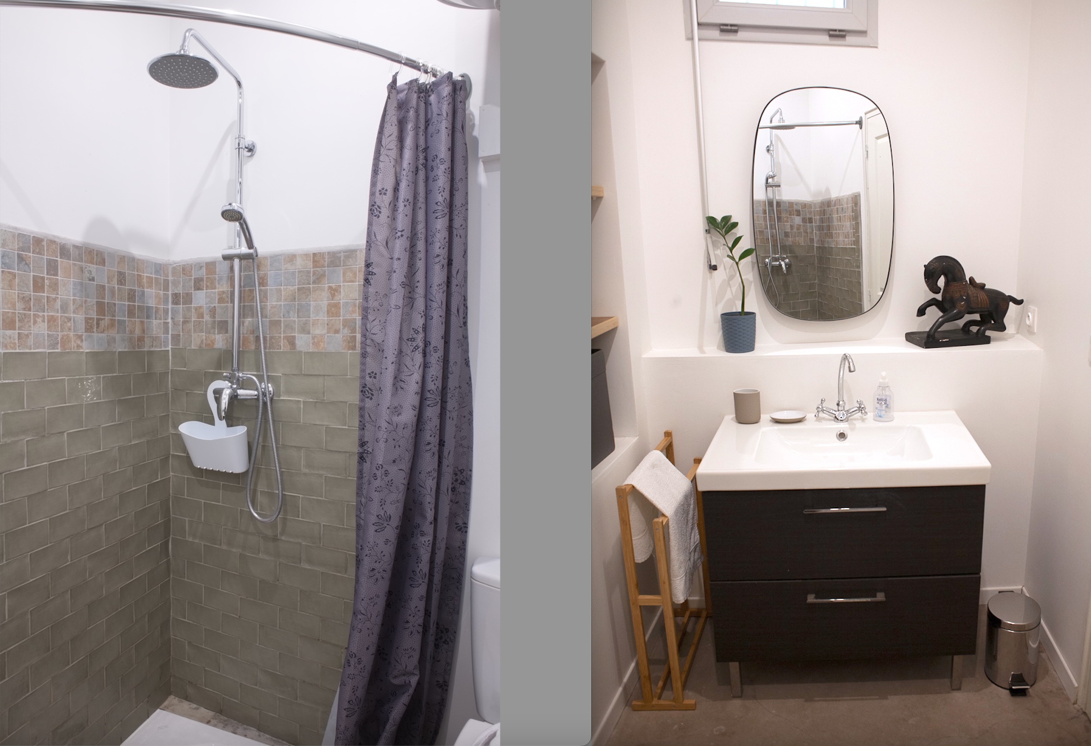 La salle d'eau privative est moderne et lumineuse et dispose d'une douche, d'une toilette et d'un lavabo.