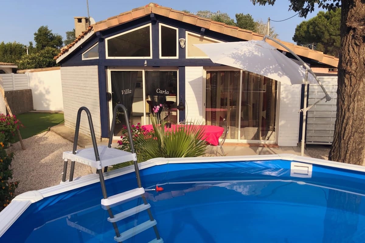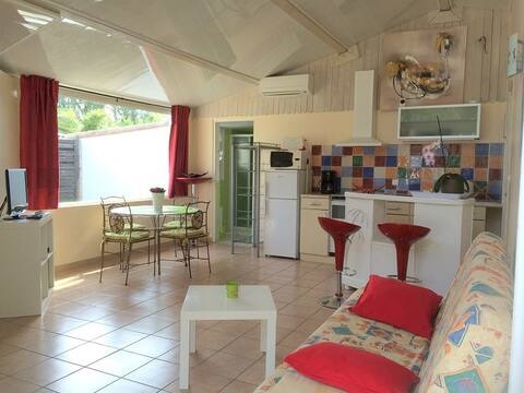 Villa F2 indépendante, climatisée, piscine privée, plage à 5mn à pied. Au calme. Terrain clos. 2 à 3 personnes max.