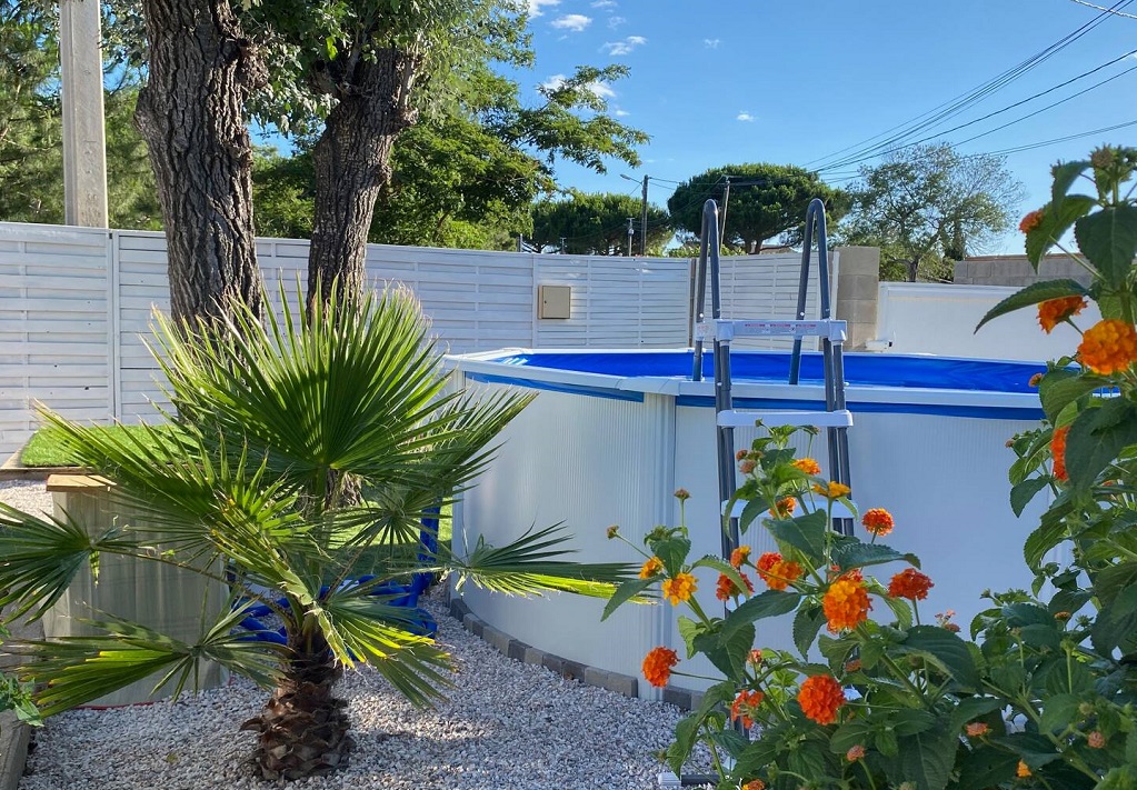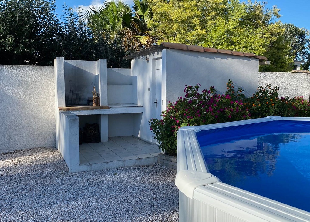 Jardin clos de 400 m² avec piscine privée hors sol de 3,5m de diamètre sur 1,20m de haut.