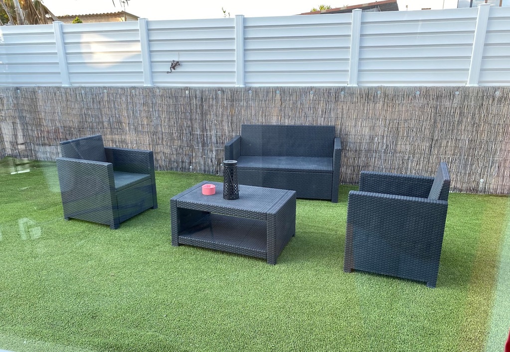 Coin pelouse avec transats, salon de jardin pour manger dehors, BBQ en dur.