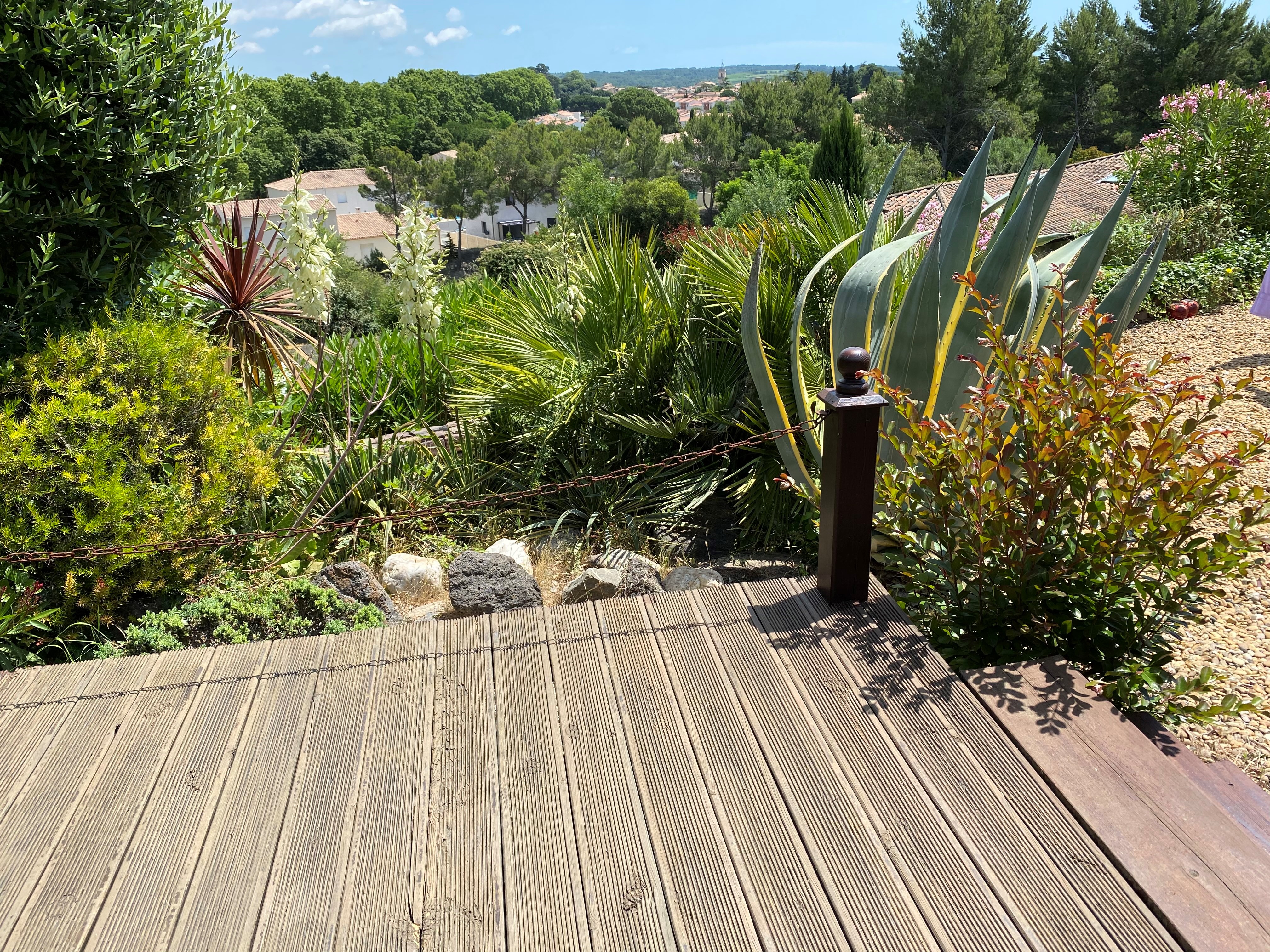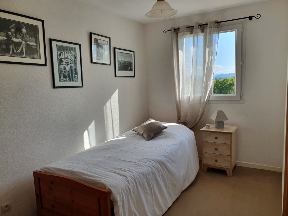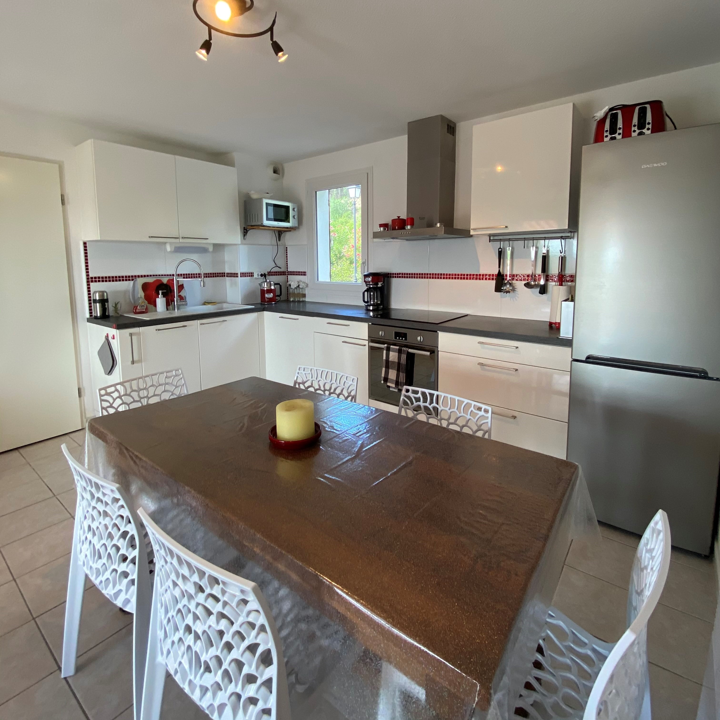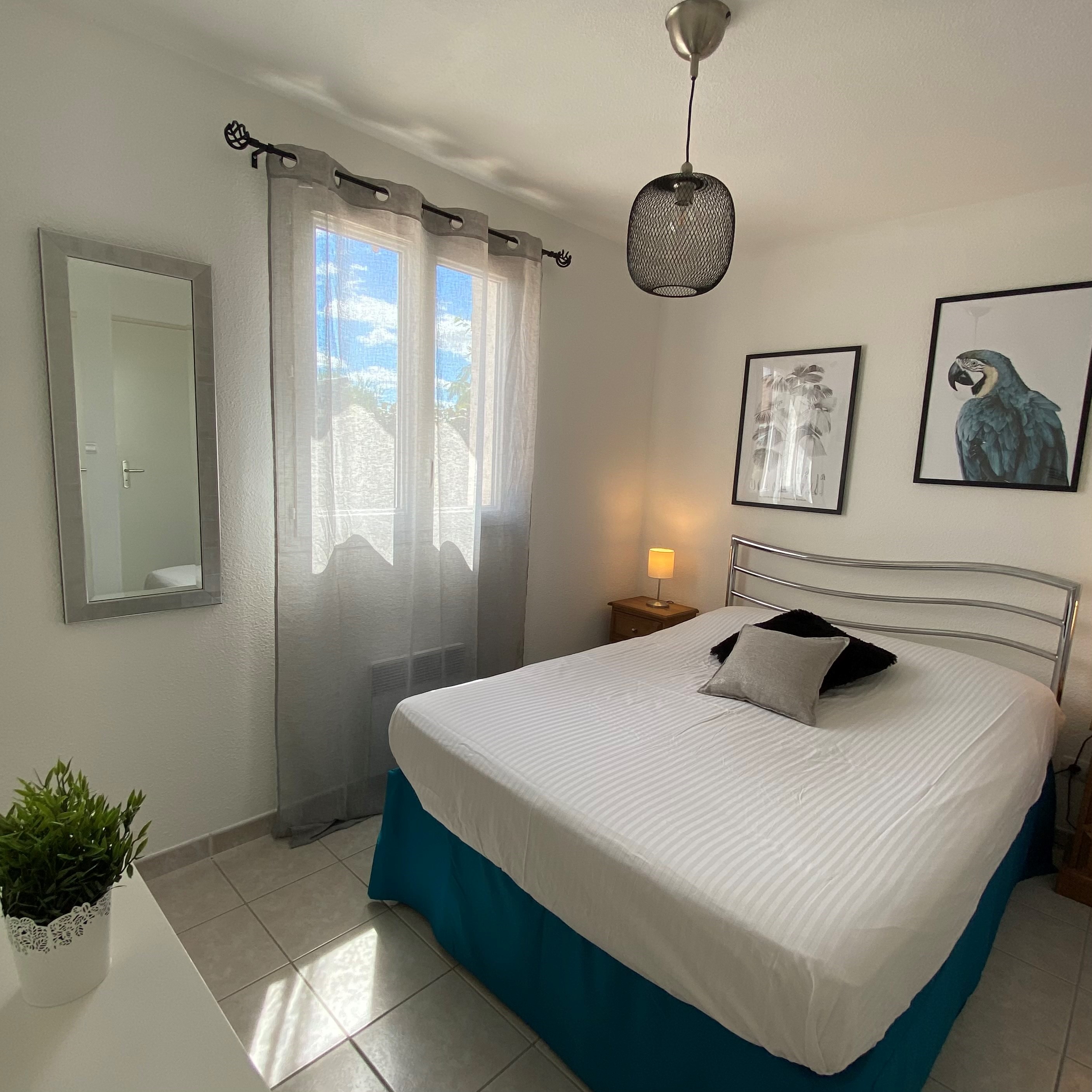 Au sein d’un domaine résidentiel entièrement clos et sécurisé avec piscine commune, notre charmante villa, entièrement climatisée, vous permettra de profiter du jardin méditerranéen privatif et de la jolie vue sur la campagne languedocienne. Au rez-de-chaussée : une entrée, un espace de vie avec cuisine à l’américaine tout équipée et salon-séjour ; Une chambre parentale avec lit 140x190cm avec placards, mobilier de rangement et sa salle de bain privative (lavabo, douche, WC). A l’étage : 2 chambres, la première équipée d’un lit 2 personnes 140x190 cm avec placard et la seconde d’un lit 1 personne 90x190cm avec placards. Une salle de bain (avec lavabo et baignoire) et un WC séparé.