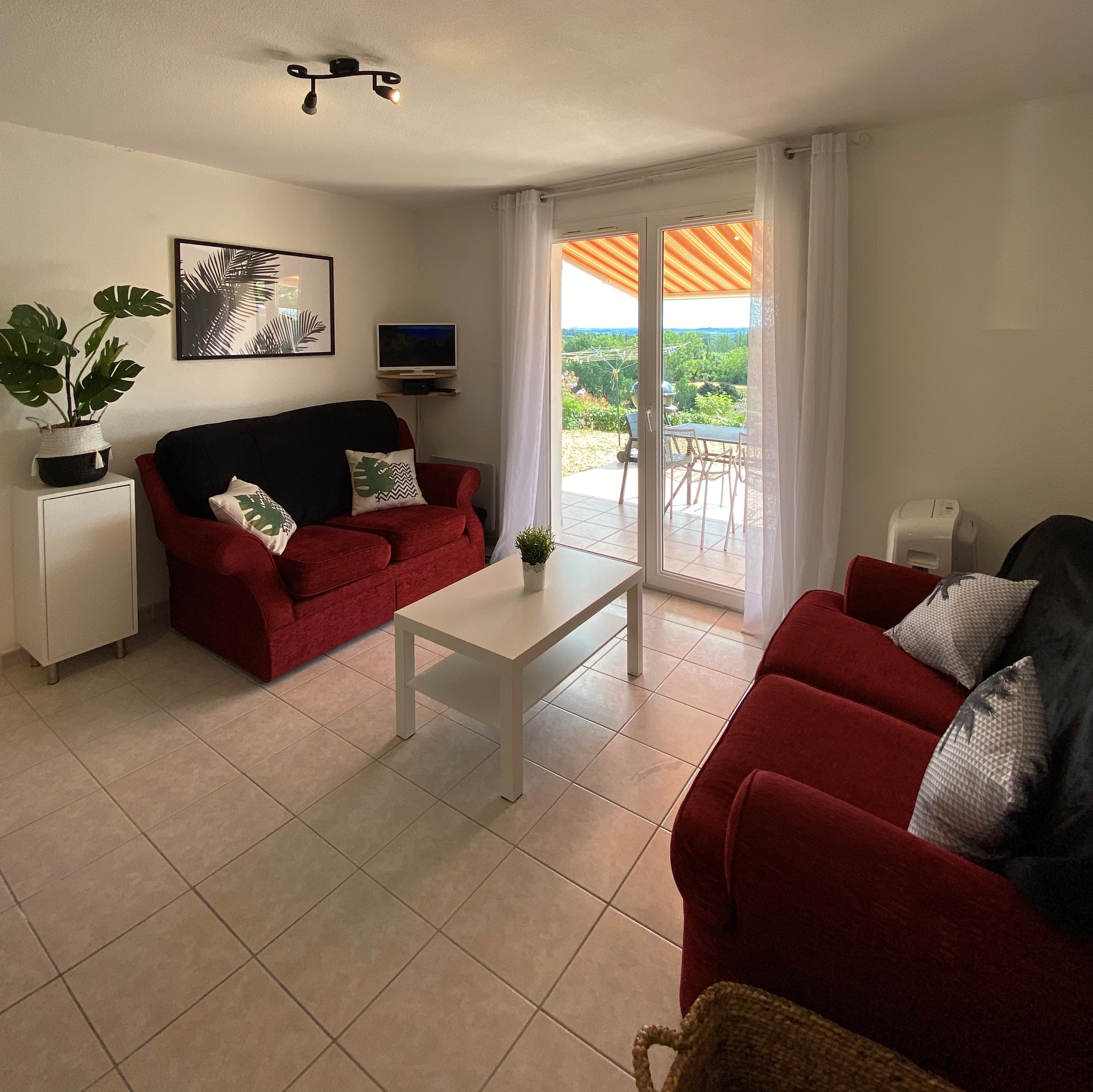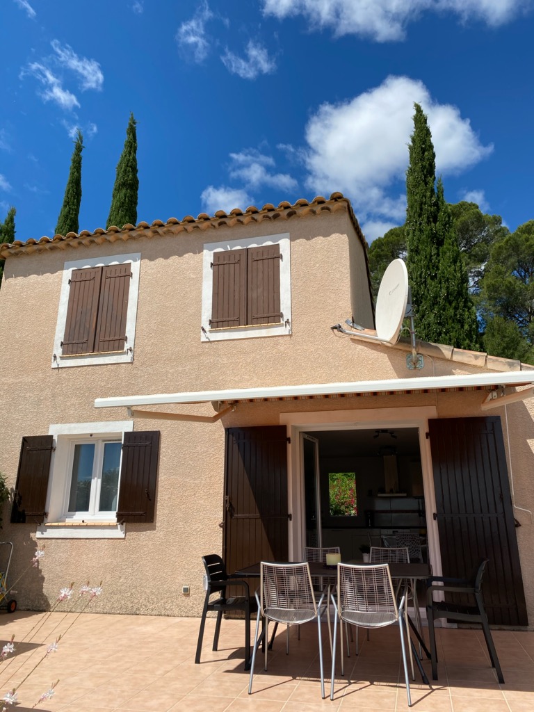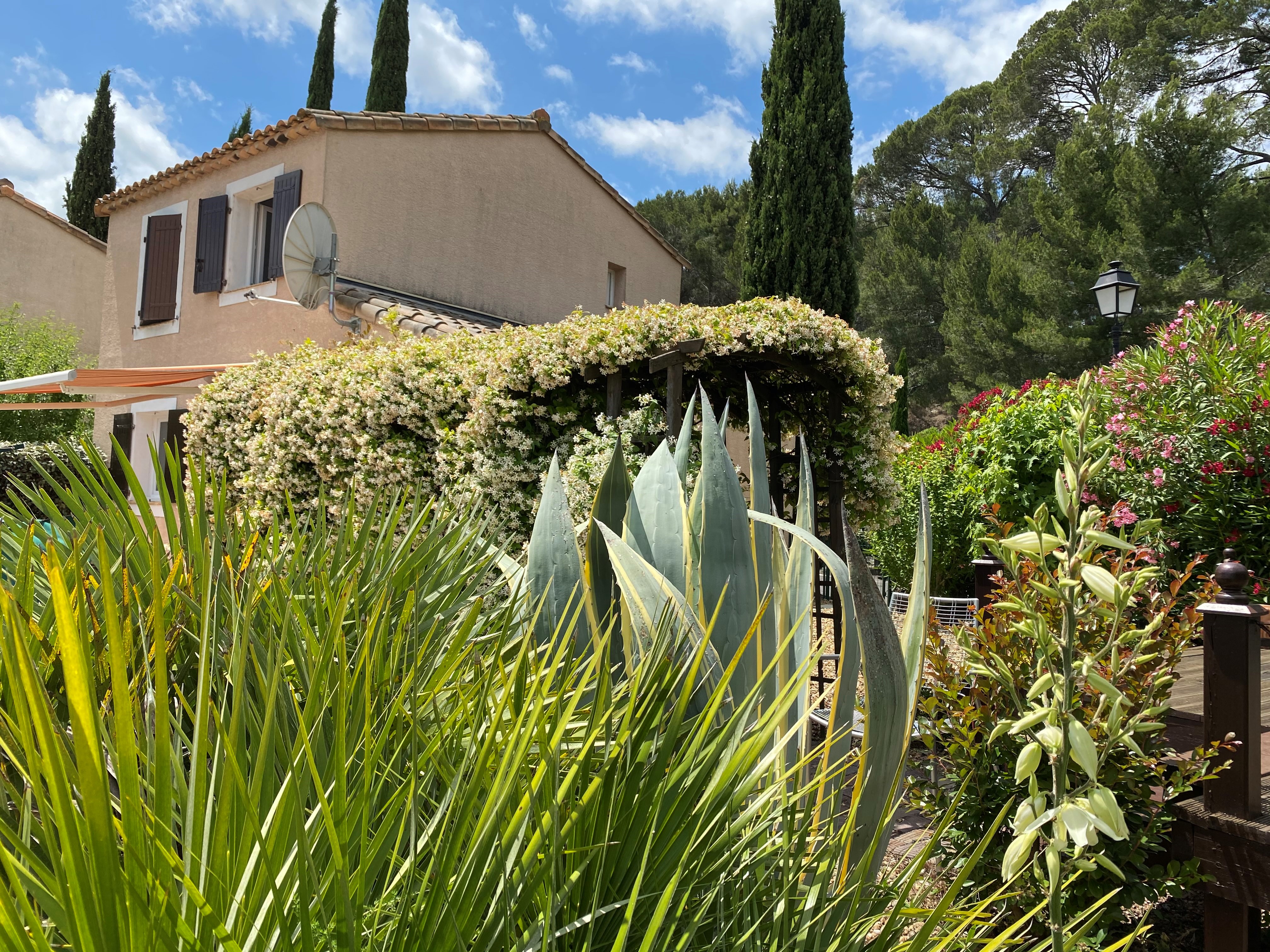 Belle villa, décorée avec soin, dans un domaine résidentiel, avec piscine commune, terrasse donnant sur un jardin paysagé avec vue sur la campagne environnante. Parking.