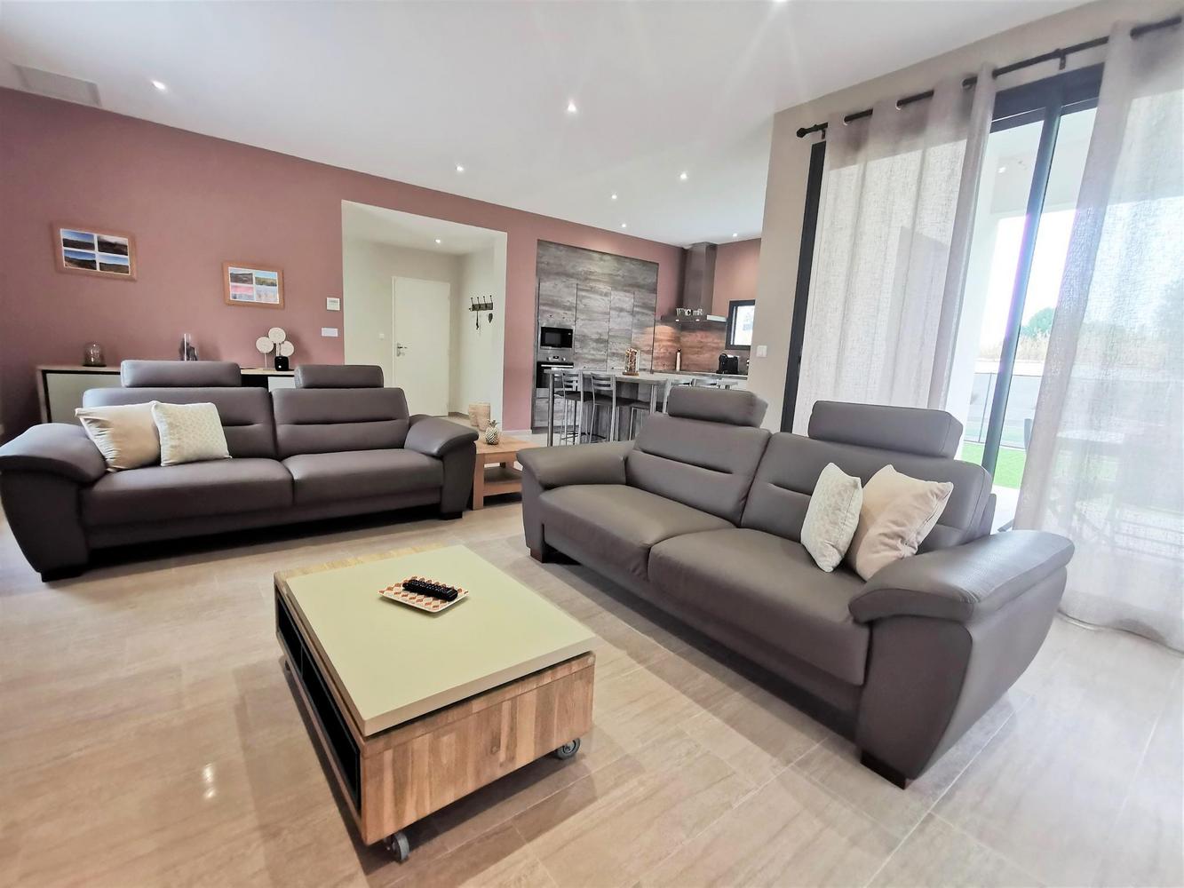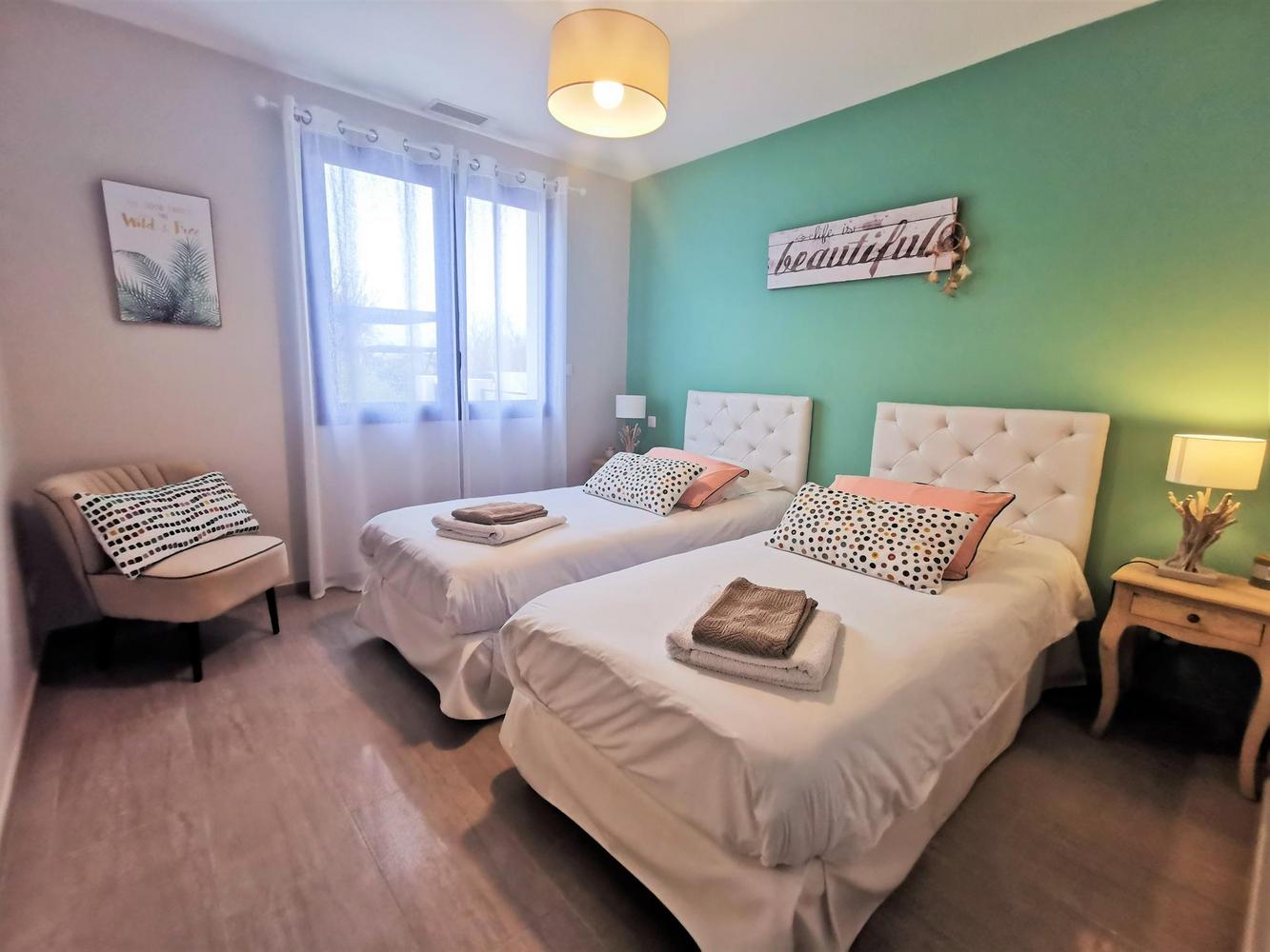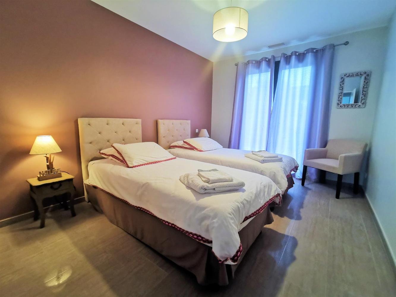 Cuisine avec îlot/repas central, salon, 2 chambres comprenant chacune 2 lits 90X200 modulables en lit 180X200, 1 chambre avec salle d'eau/wc privatifs équipée de 2 lits 90X200. 2è salle d'eau indépendante, wc.