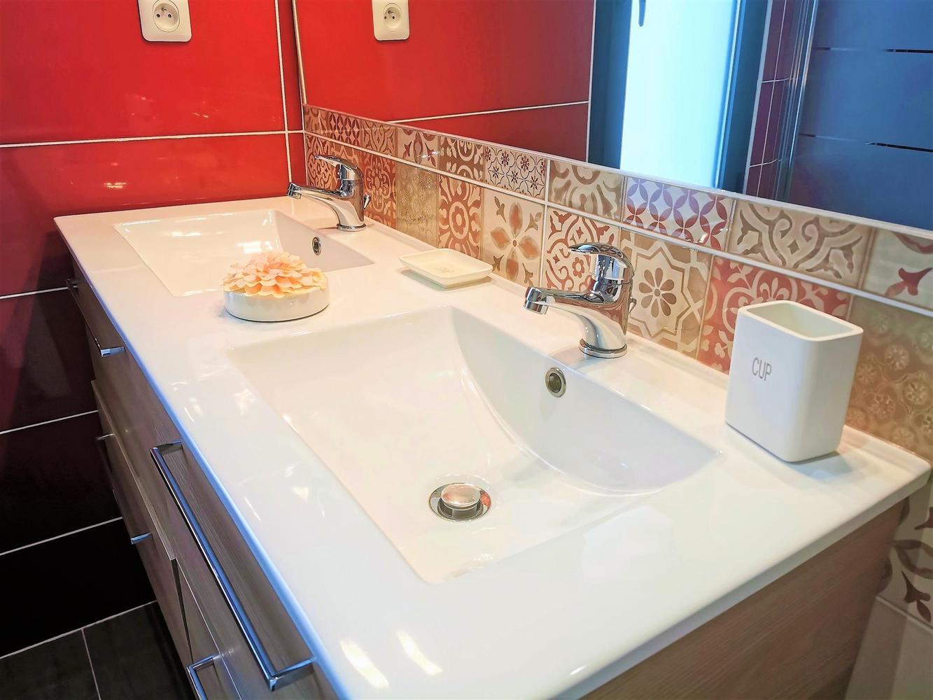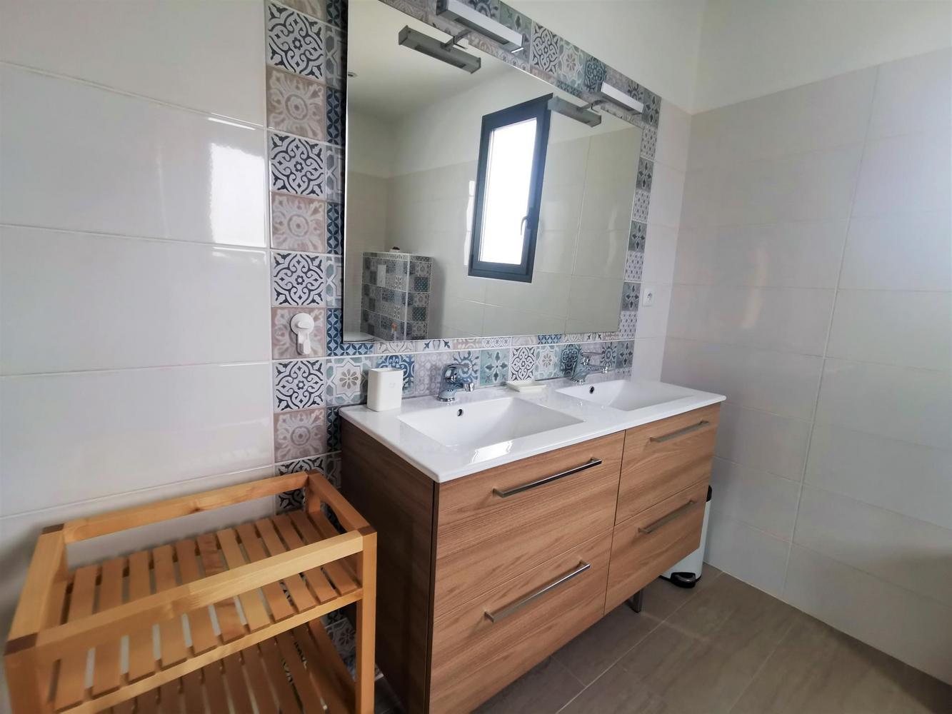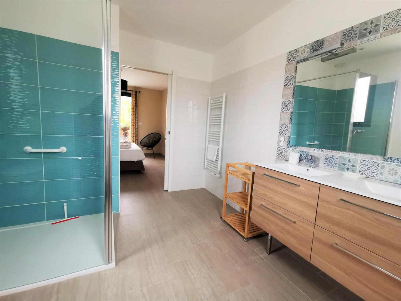 Cuisine avec îlot/repas central, salon, 2 chambres comprenant chacune 2 lits 90X200 modulables en lit 180X200, 1 chambre avec salle d'eau/wc privatifs équipée de 2 lits 90X200. 2è salle d'eau indépendante, wc.