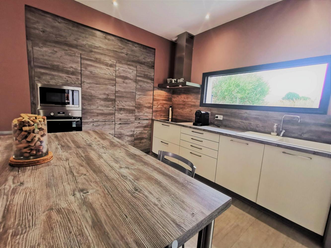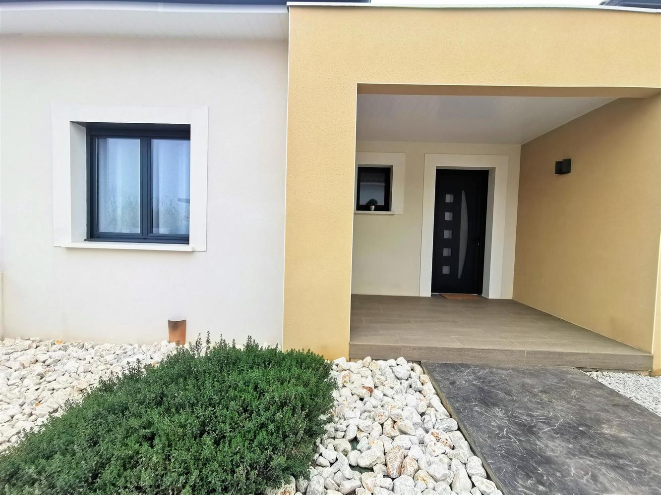 Proche du centre du village, en bordure du vignoble, villa aménagée de plain-pied au rez de chaussée : pièce de jour spacieuse ouvrant sur un jardin clos de 500 m² sans vis à vis et une terrasse couverte