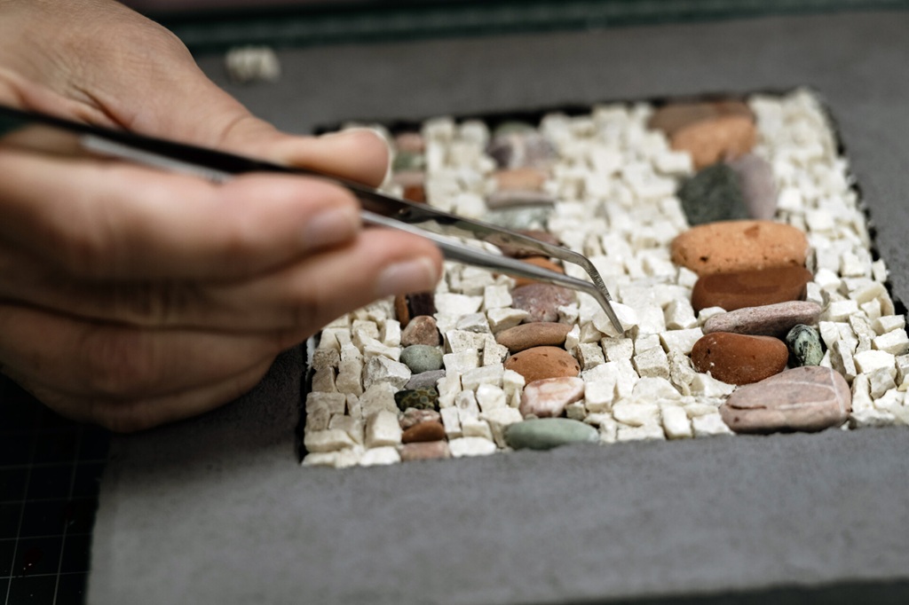 Artisane d’art formée par des maîtres mosaïstes, Laurence Léonet taille les tesselles de manière traditionnelle à l’aide d’une marteline et d’un tranchet.