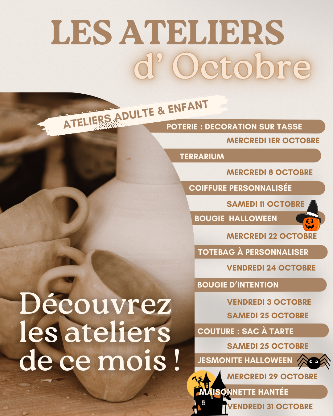 Ateliers pour petits et grands, dans un espace dédié à l'inspiration et au partage : Bougies d'intentions, terrariums, couture, poterie, macramé…