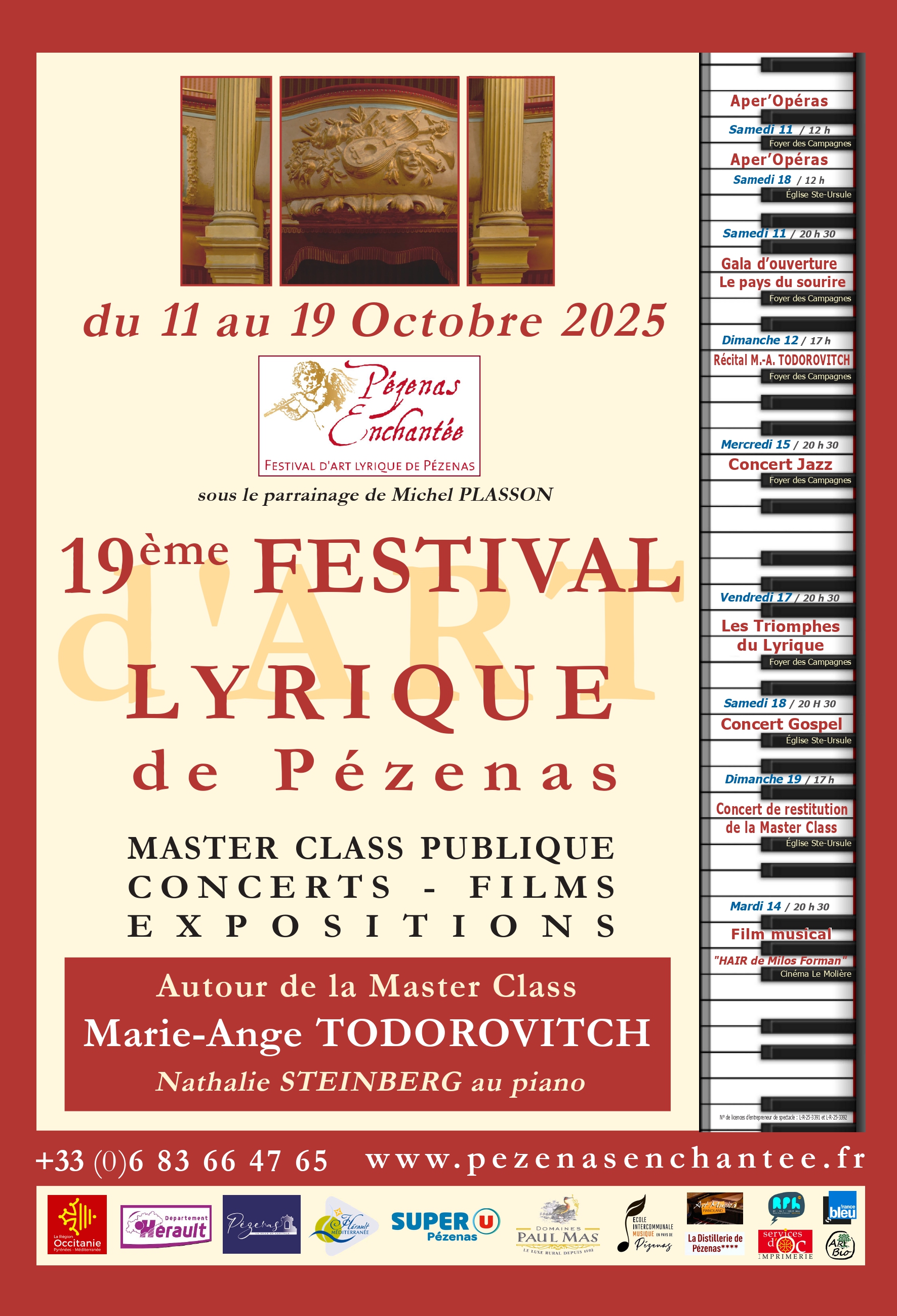 Pézenas enchantée vous présente le 19ème festival Lyrique de Pézenas, du 11 au 19 octobre 2025 avec entres autres : concerts, films, expositions, master class publique.