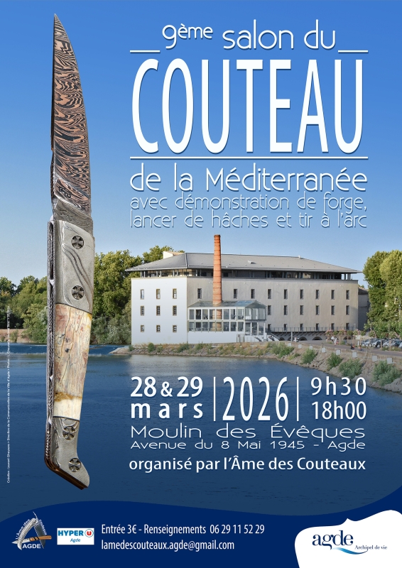 La 9ème édition du Salon du Couteau se déroulera les 28 et 29 mars 2026 au Moulin des Evêques en Agde avec de nombreux exposants issus du monde de la coutellerie artisanale.