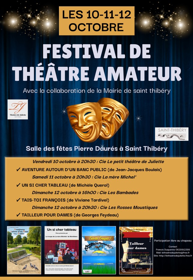 Vendredi 10 octobre à 20h30 : Aventures autour d’un banc public (Cie le petit théâtre de Saint Thibéry) Samedi 11 octobre à 20h30 : Un si cher tableau (Cie la mère Michelle de Montblanc)