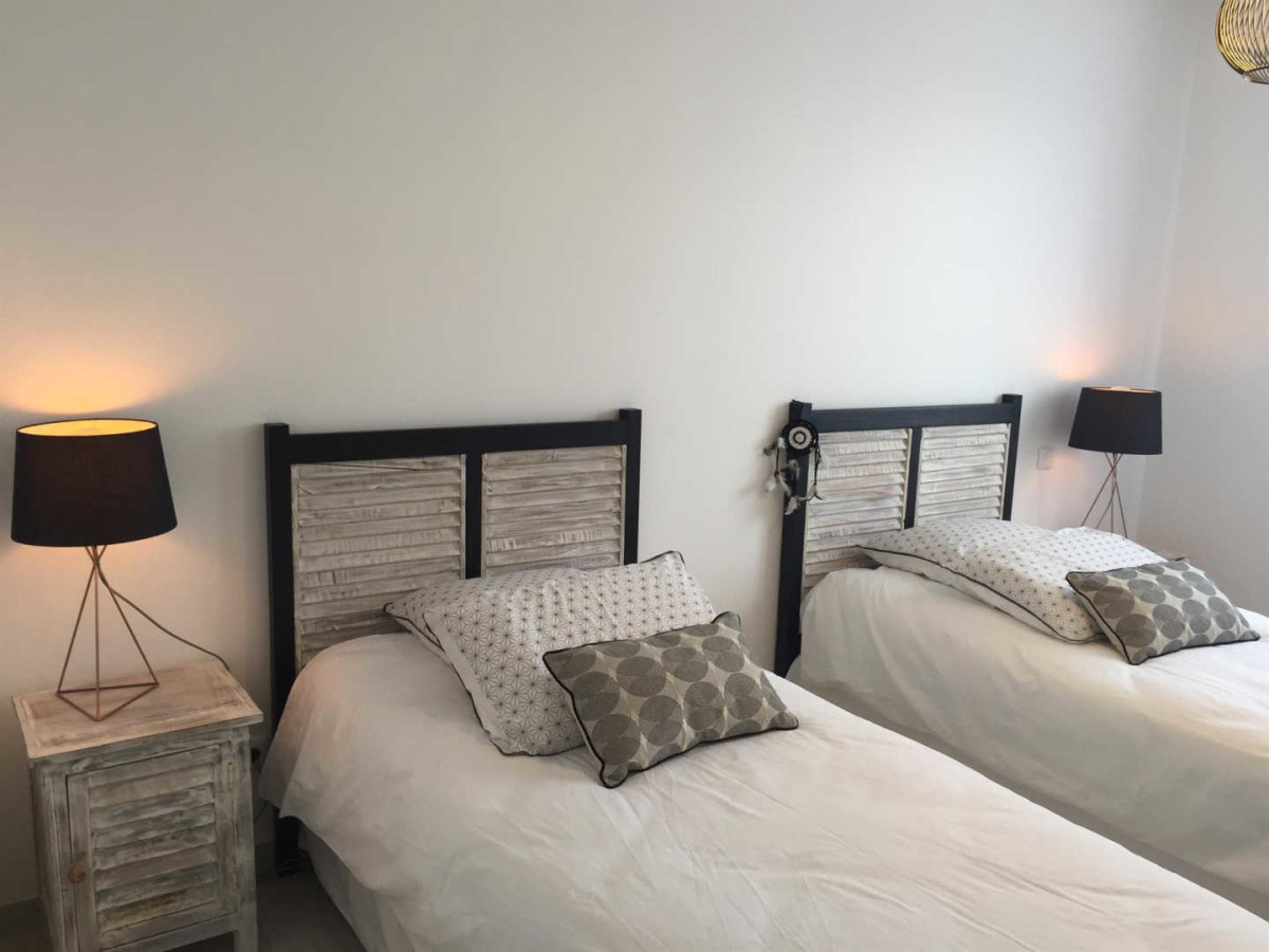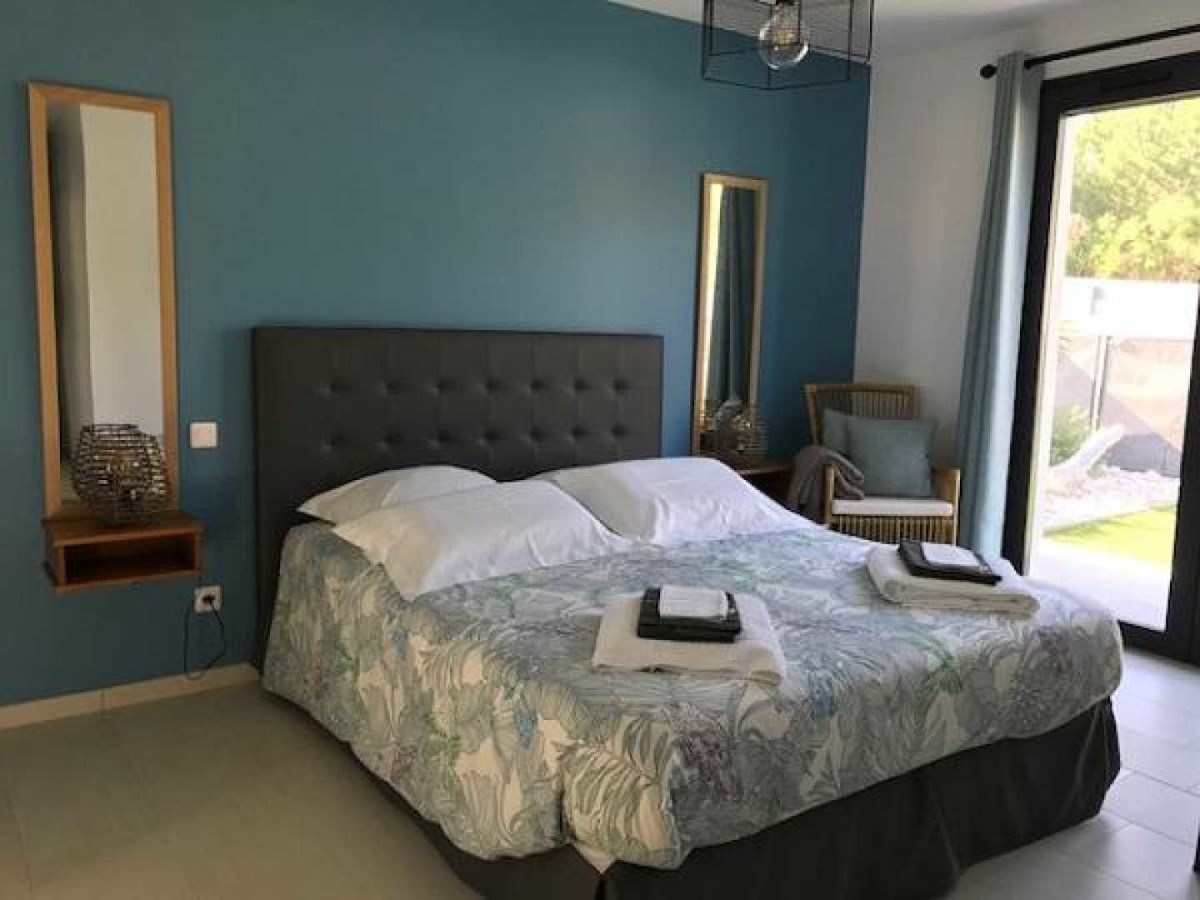 Accès direct sur la piscine sécurisée chauffée de juin à octobre. 2 chambres comprenant chacune 2 lits 90X200 modulables en lit 180X200, 3ème chambre avec salle d’eau/wc privatifs équipée d’un lit 160X200. 2ème salle d’eau indépendante, wc. Chauffage électrique inclus, wifi, climatisation, matériel bébé, lits faits à l’arrivée et linge de toilette fourni, ménage fin de séjour inclus, caution de 1000€. Salon de jardin, barbecue, parking. Superficie : 115 m².