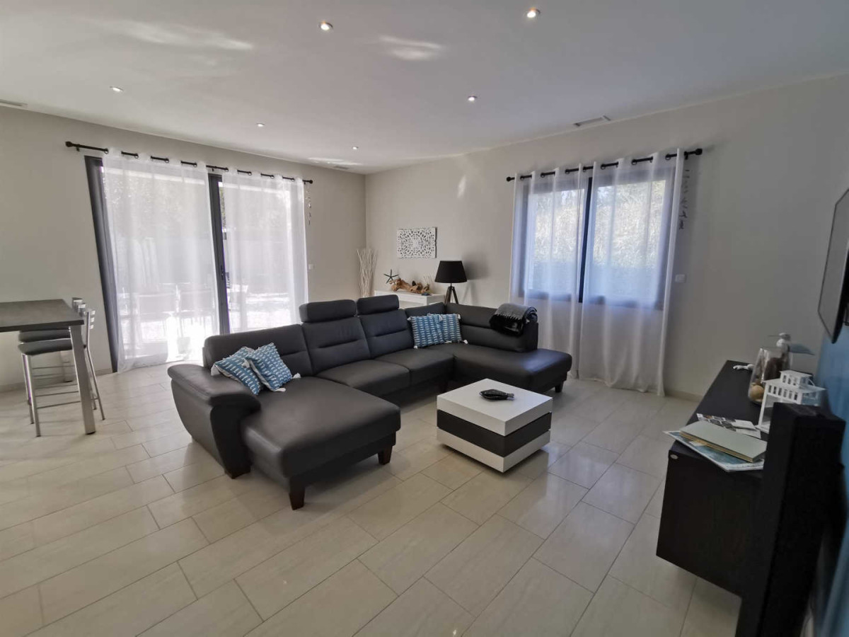 Entre Sète et Béziers, proche du centre du village, en bordure du vignoble, villa aménagée de plain-pied au rez de chaussée : pièce de jour spacieuse avec sa cuisine ouverte toute équipée, séjour ouvrant sur un jardin clos sans vis à vis et une terrasse couverte