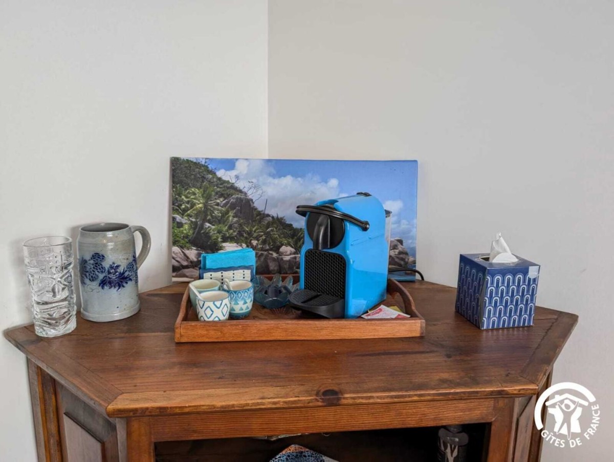 La chambre de style moderne et exotique est à l’étage de la maison des propriétaires. L’étage avec la chambre, la salle d’eau et les toilettes sont réservés aux vacanciers.