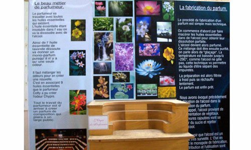 Élaboration d'huiles essentielles et fabrication de parfums à partir de fleurs : distillation, macération, réfrigération et impression du flacon, visite de l'orgue du parfumeur ; histoire de la fabrication du parfum depuis 8000 ans. Une collection de plantes régionales est présentée à côté du parking d'accueil ; élaboration de sirops de fruits sauvages et dégustation en fin de visite.
