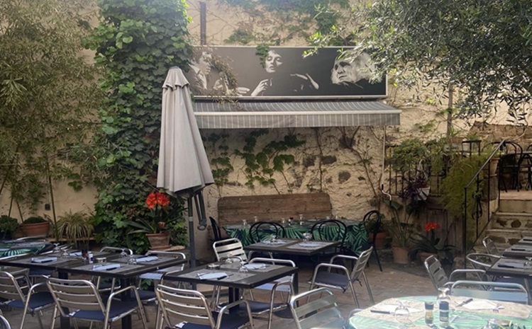 Restaurant au feu de bois grillade poisson et viande avec patio extérieur arboré
