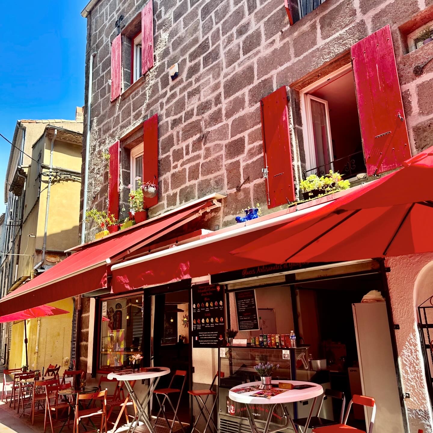 Le Glacier La Suite vous attend pour une pause gourmande aux numéros 33, 35 et 37 de la rue de l'Amour, rue piétonne authentique du centre historique d'Agde, fraîche et ombragée l'été.