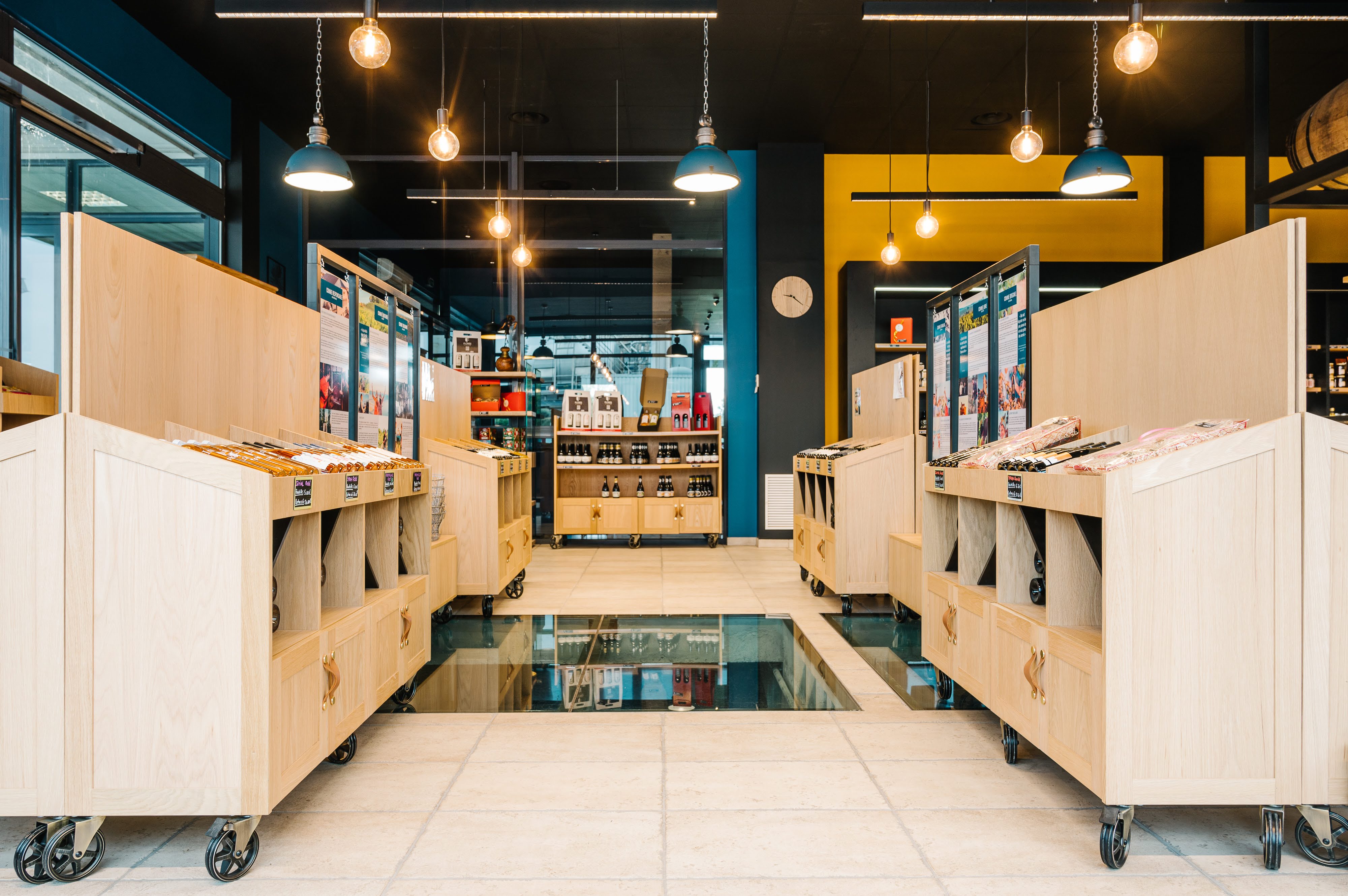 L’espace dégustation-vente est conçu autour d'un caveau moderne, regroupant vins, produits de terroir et goodies.