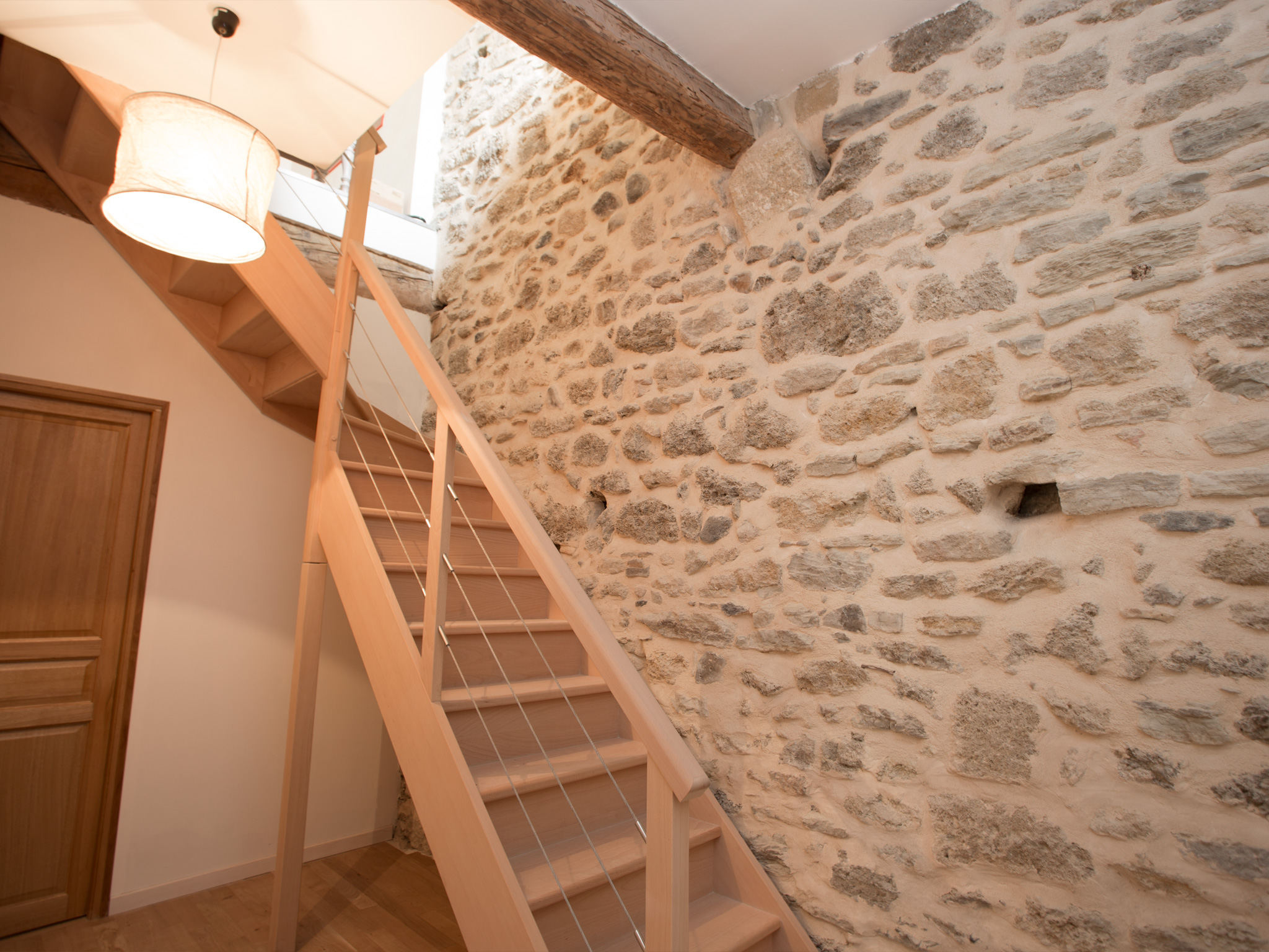 Vous aimerez sa cuisine toute équipée donnant sur le salon avec son îlot central. La rénovation a consisté à mettre en valeur le bois et la pierre pour accentuer l’authenticité du lieu et procurer un sentiment de bien-être.