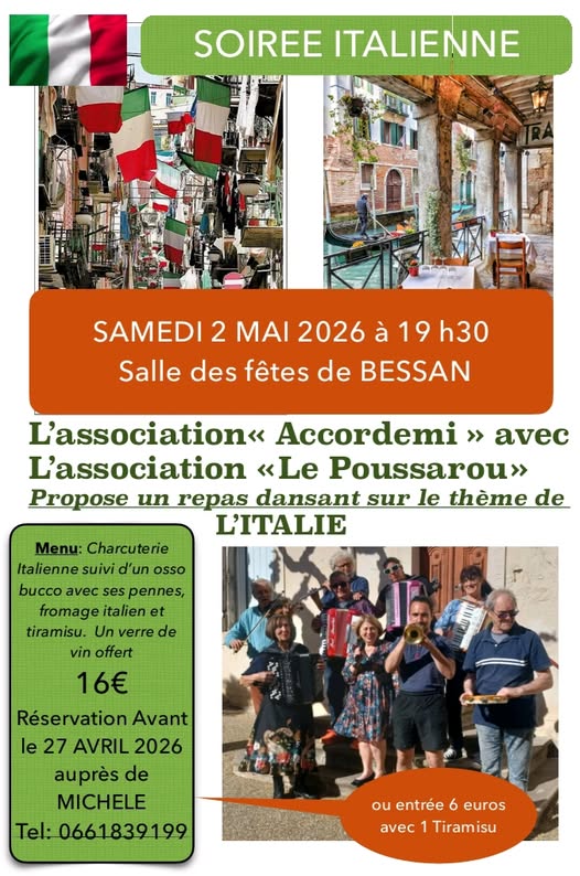 Une soirée dansante le 2 mai a Bessan sur le thème de l'Italie avec repas et jeux avec un petit lot pour le gagnant.
